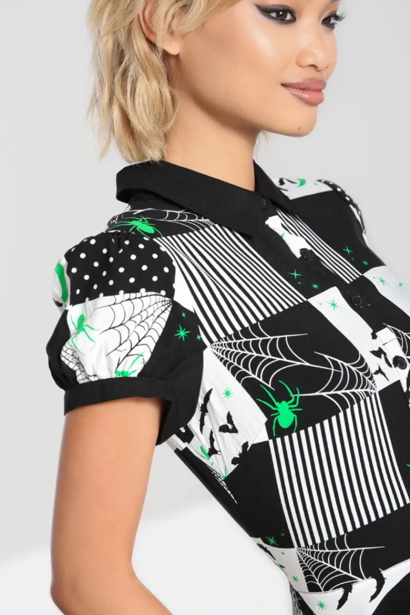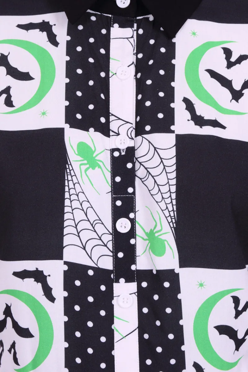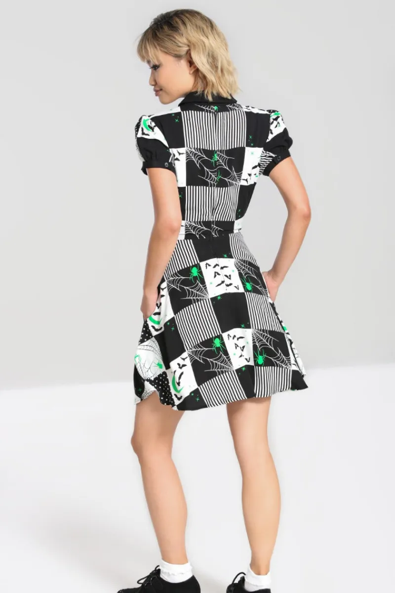 - Black and white patchwork fit-and-flare mini dress decorated with black and green spooky motifs