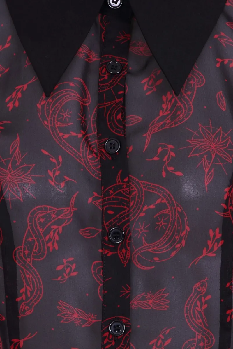 - Black chiffon blouse decorated with an all-over red snake & moon design
