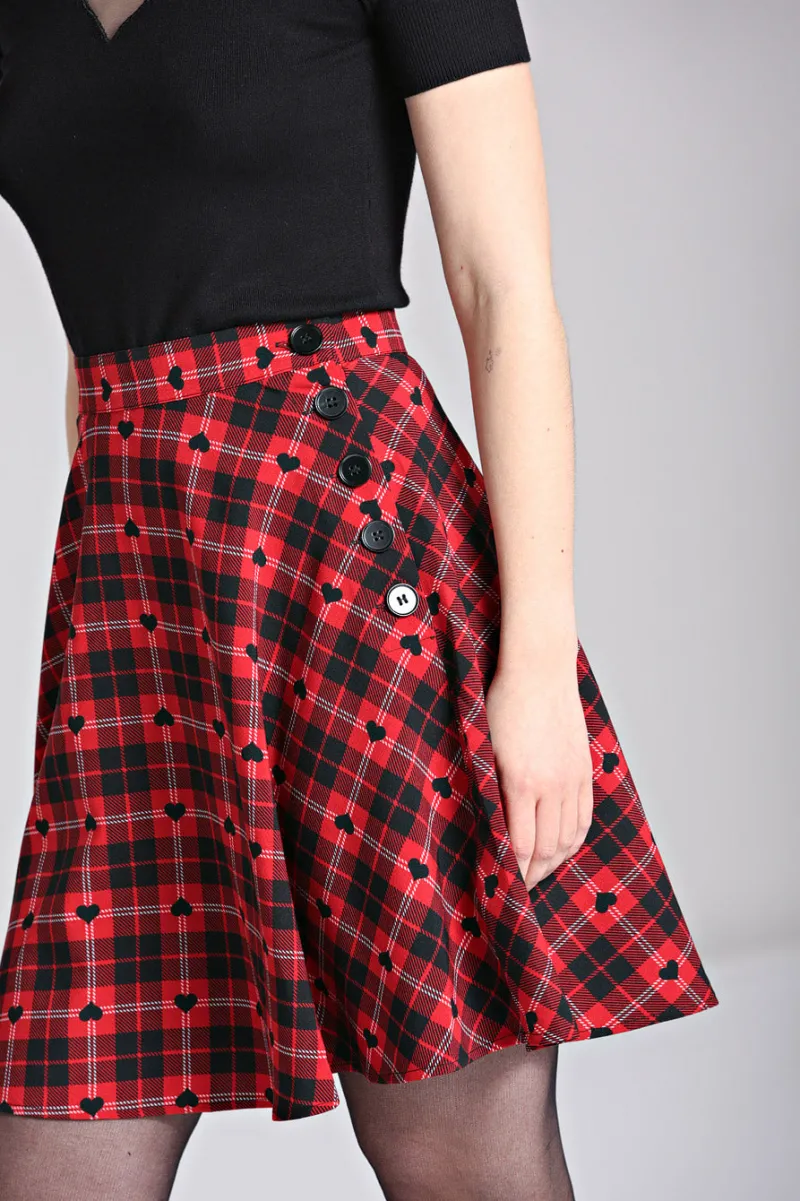 - Red and black printed tartan with little black hearts all over