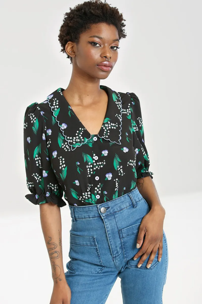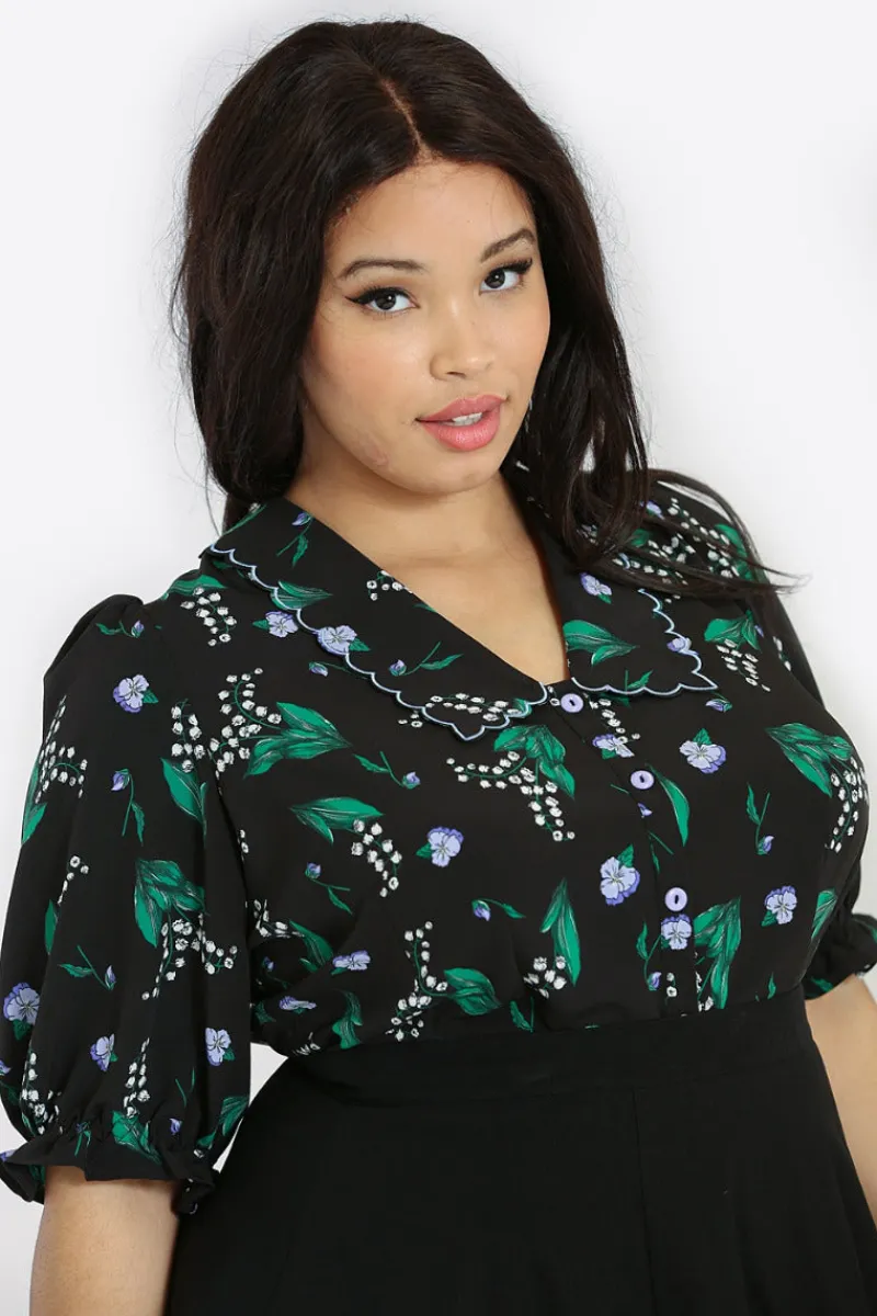 - Black semi-fitted blouse decorated with delicate lilac and white flowers