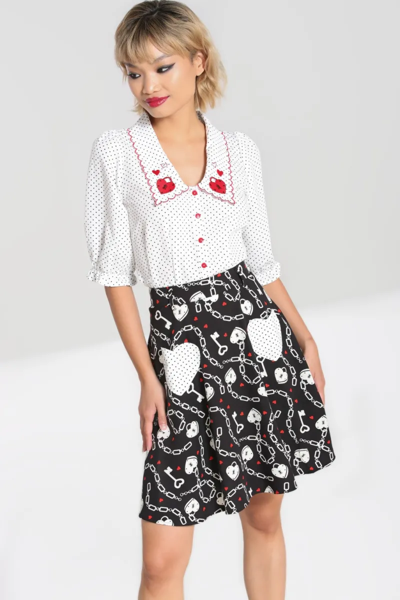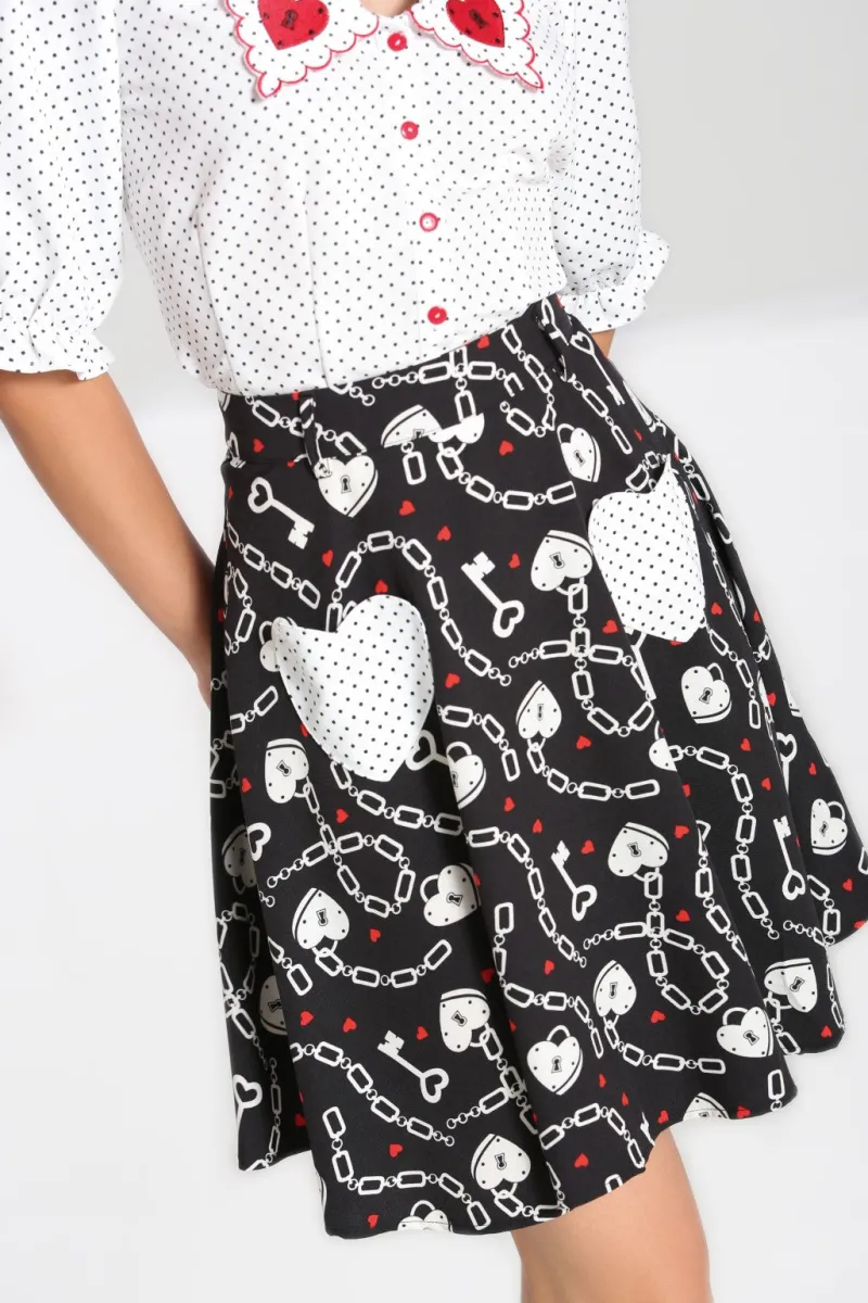 - Black mini skirt printed with red hearts and white chains & padlocks