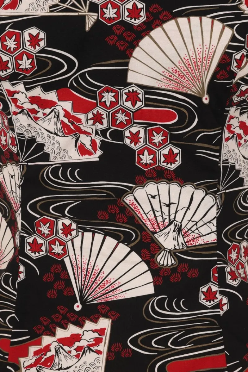 - Black, tight-fitting top decorated with oriental fans & leaves