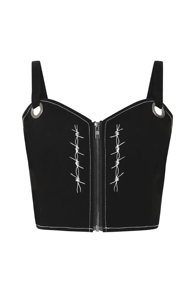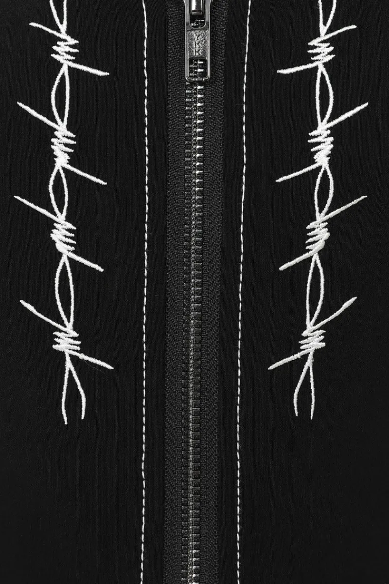 - White barbed wire embroidery either side of zip