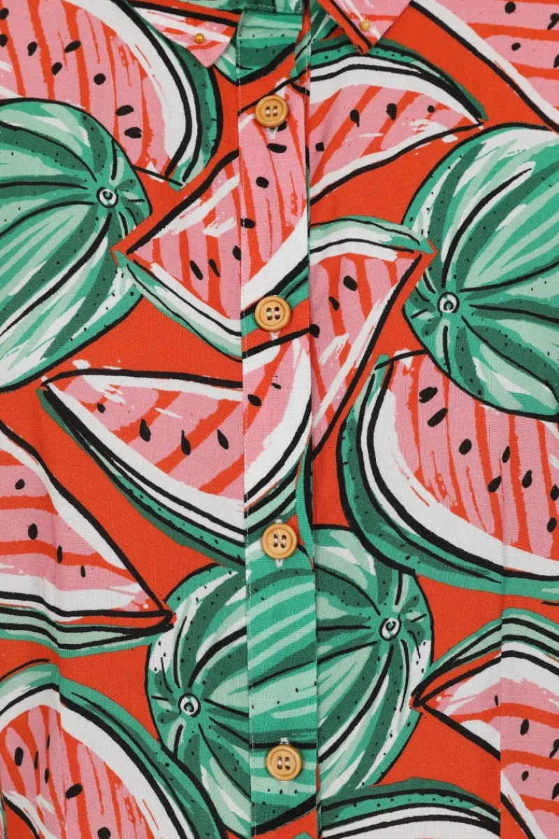 - Bright orange, semi-fitted shirt decorated with a fun watermelon print