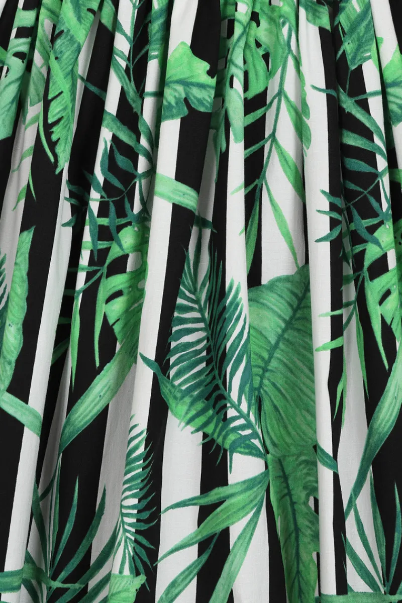 - Black and white striped 50’s skirt printed with bright green tropical leaves