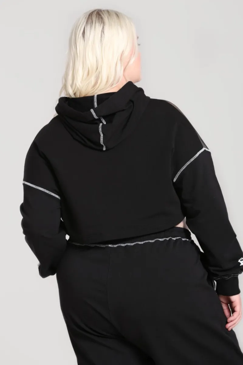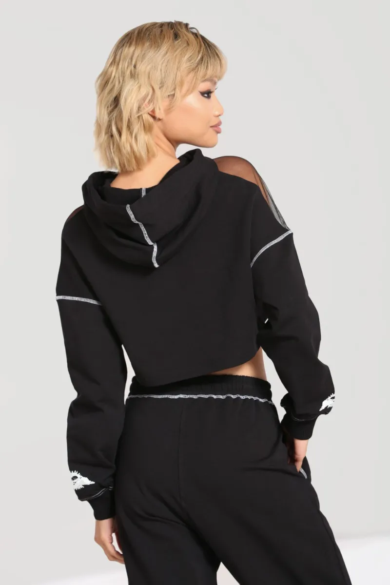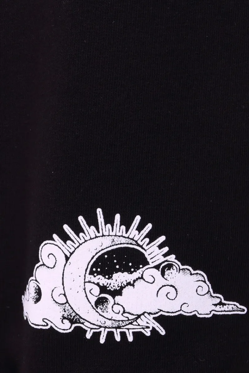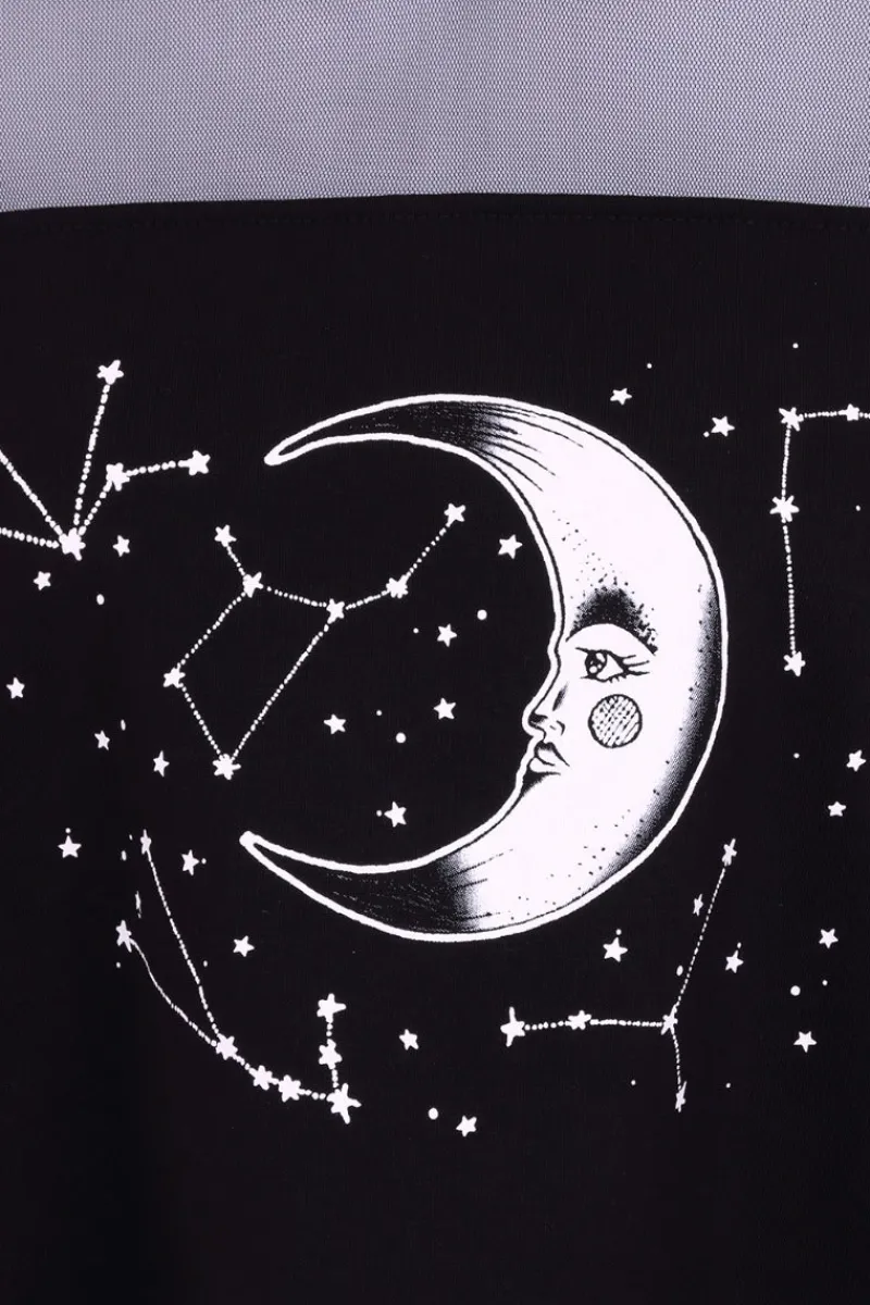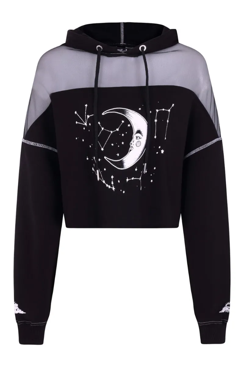 - Black cropped hoodie decorated with a starry sky and crescent moon artwork on the front
