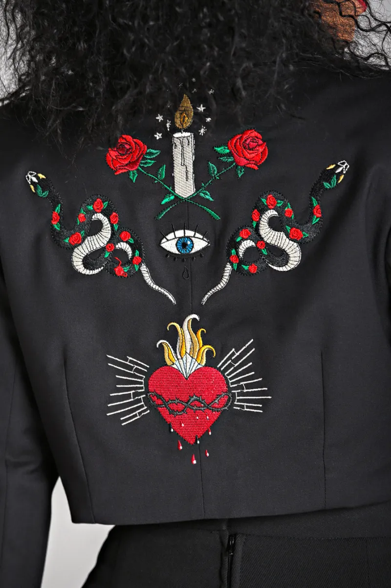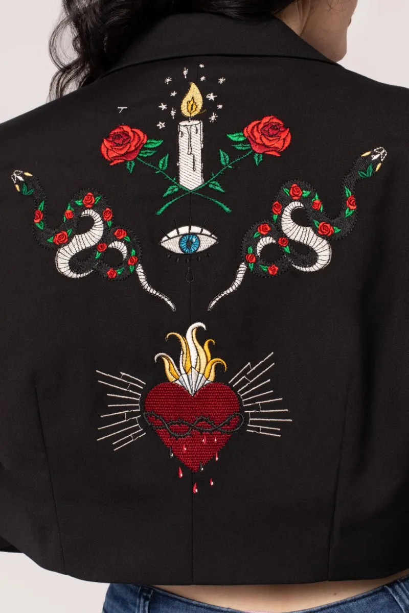 - Candle, snake & heart embroidary on centre back