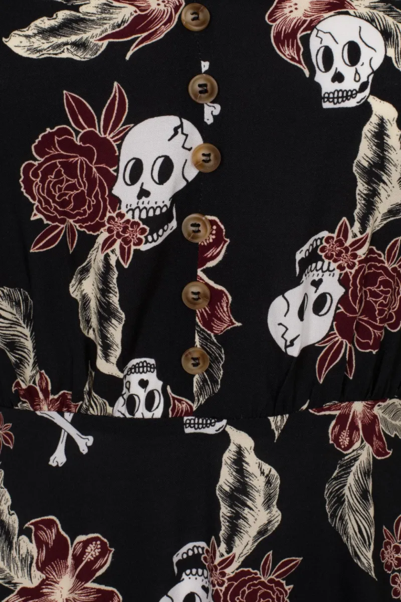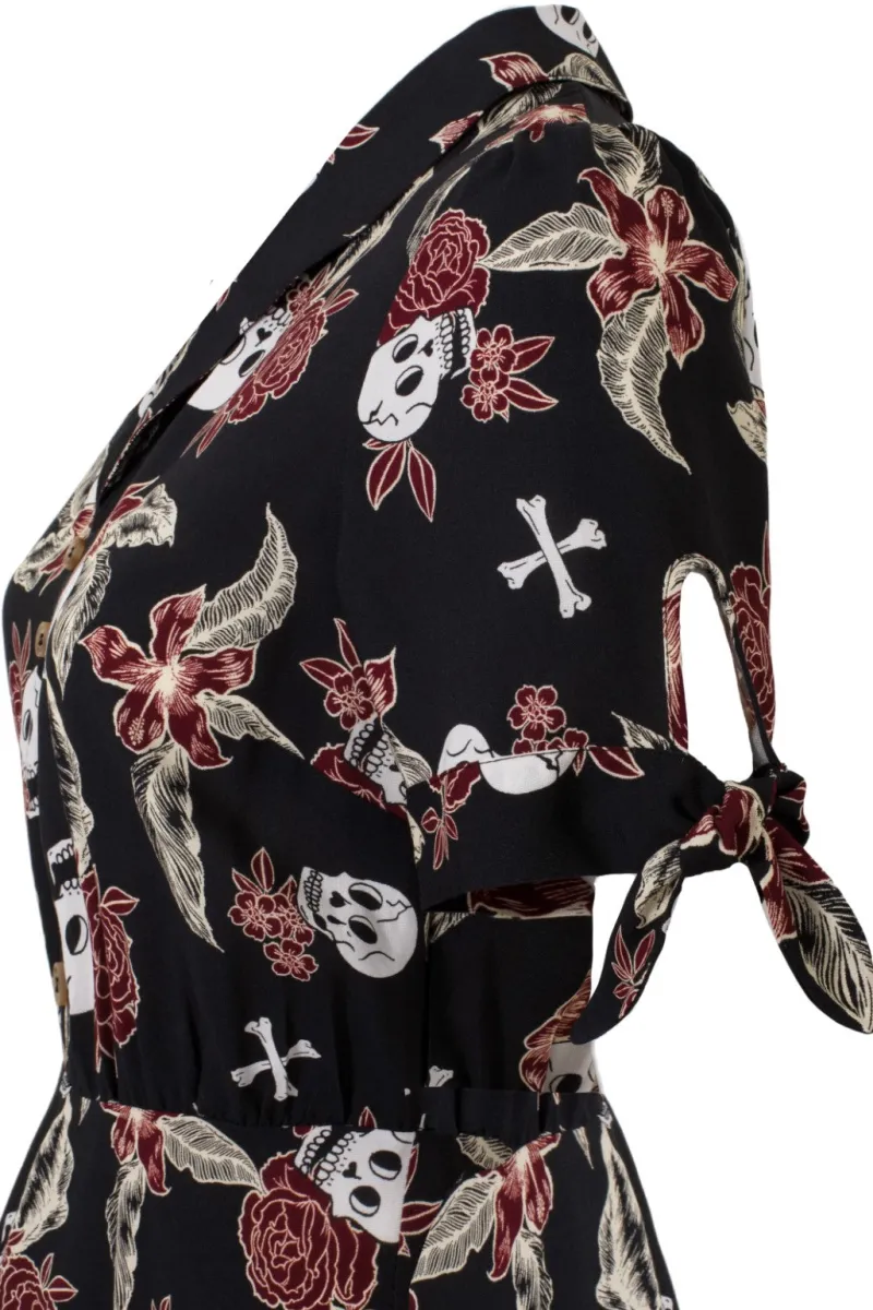 - Black base with drawn skulls, bones and tropical flowers in ivory & red