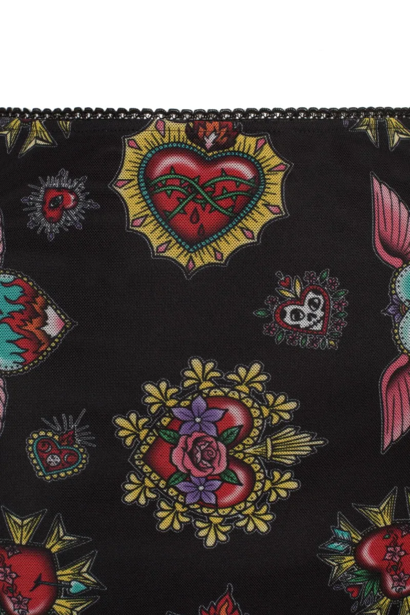 - Black base fabric with colourful heart illustrations