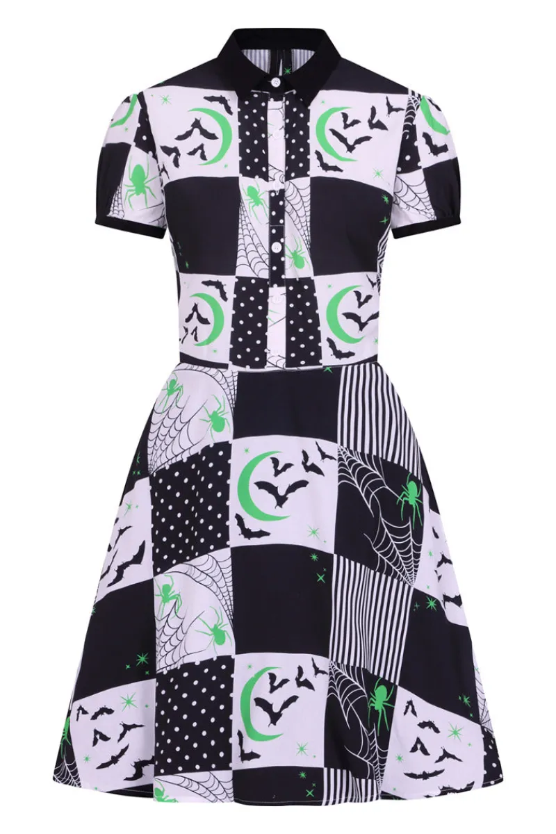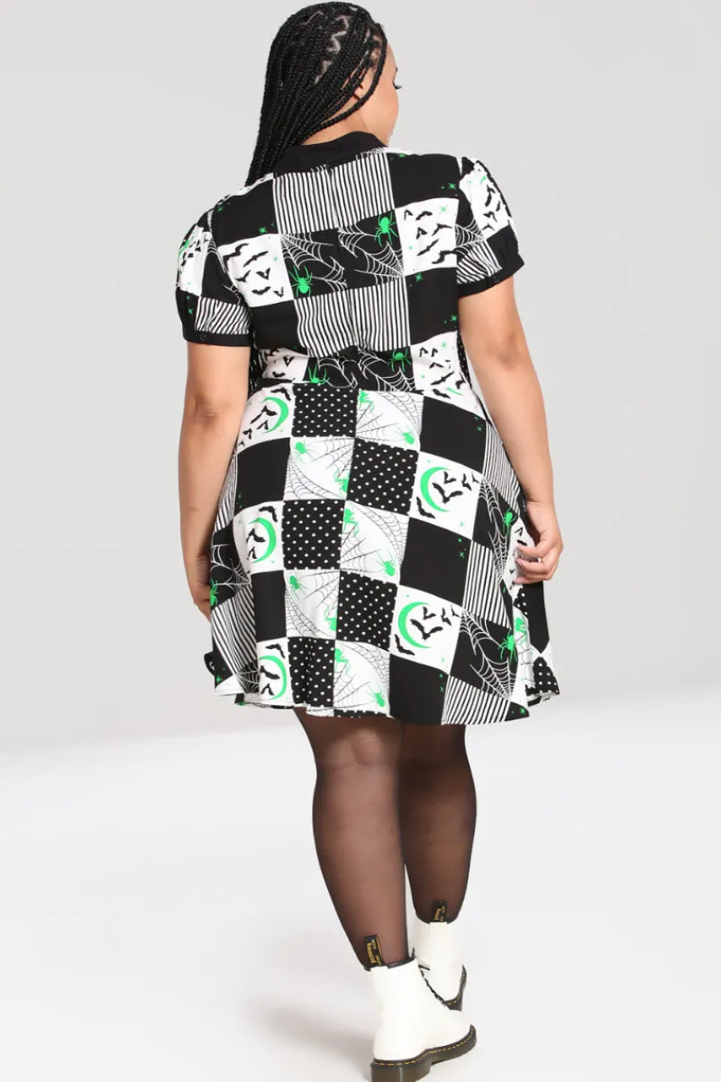 - Black and white patchwork fit-and-flare mini dress decorated with black and green spooky motifs