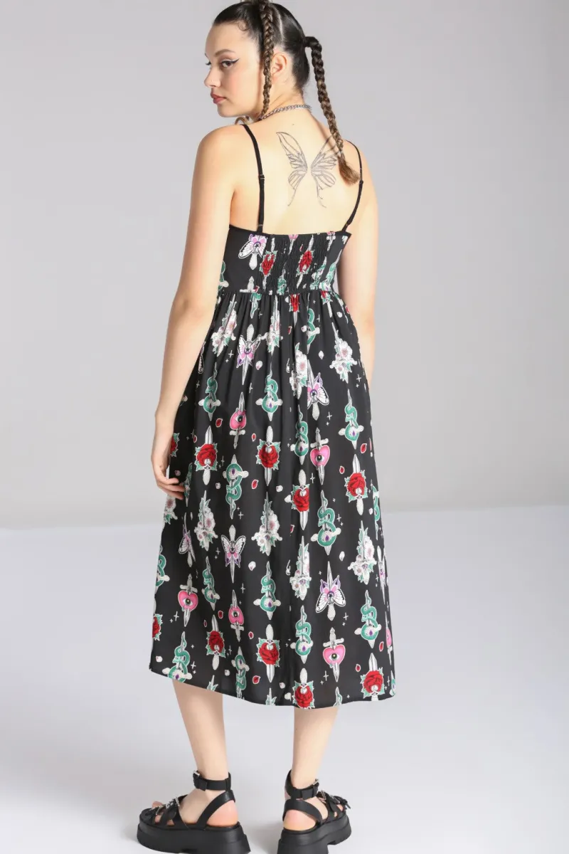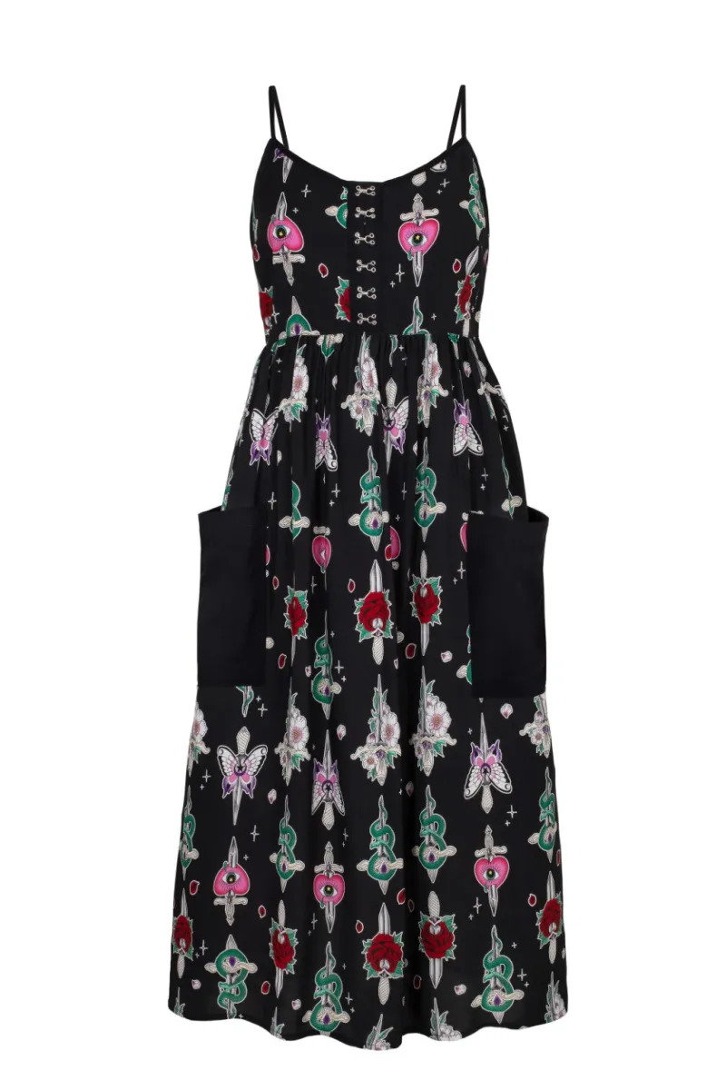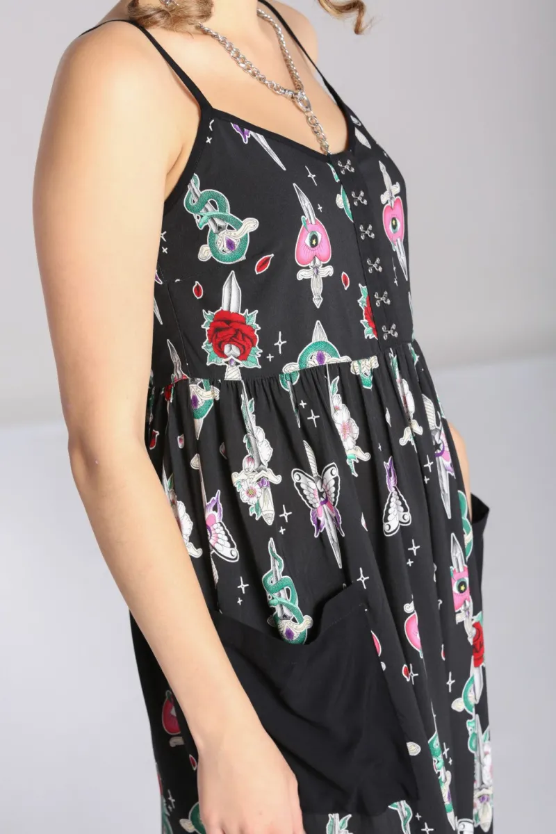 - Artwork is of tattoo style dagger and motif artwork on black base