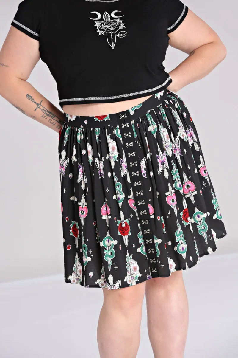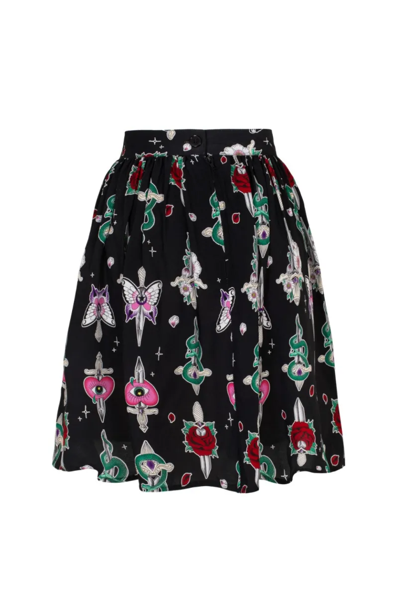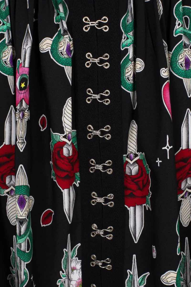 - Artwork is of tattoo style dagger and motif artwork on black base