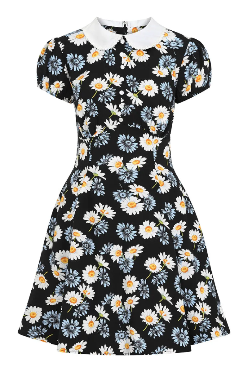 - Black fit-and-flare mini dress decorated with a delicate all-over daisy print