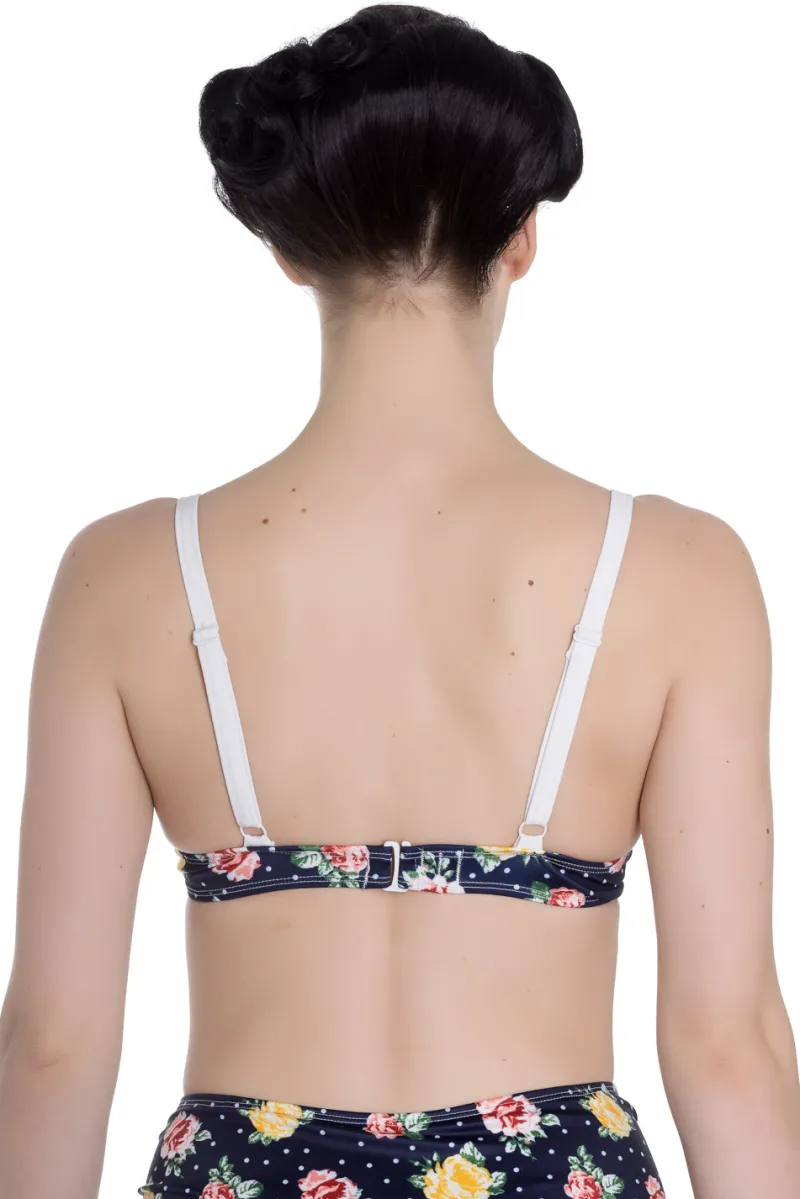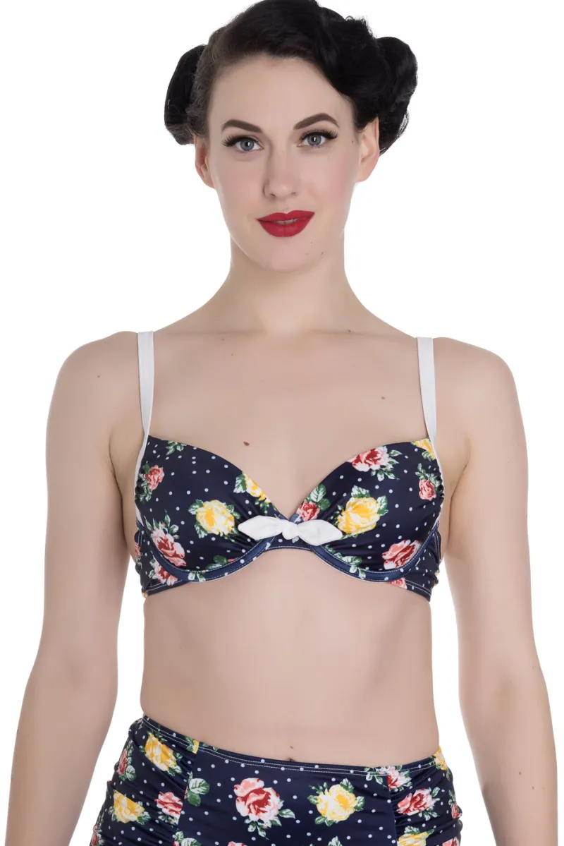 - Print is of red and yellow roses on a navy background with white polka dots.