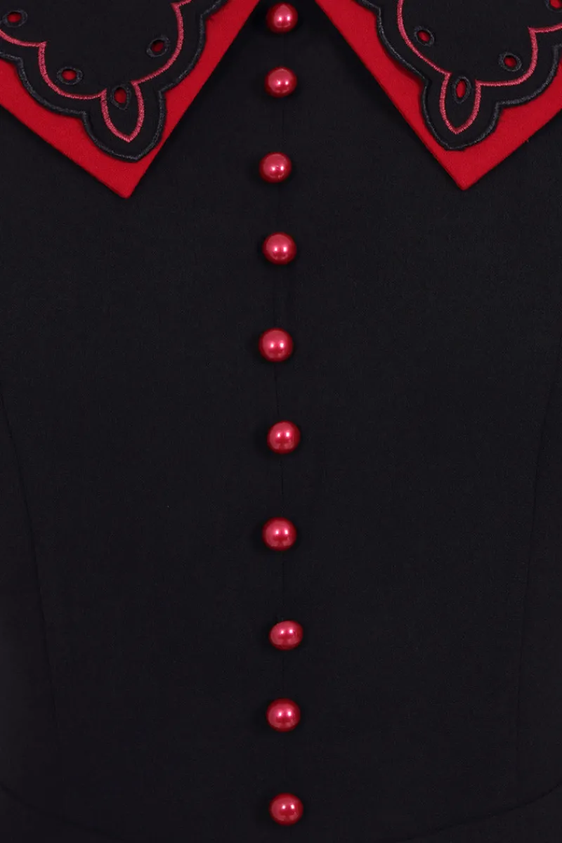 - Black fit-and-flare mini dress framed by a large statement collar with contrasting red scallop & embroidered