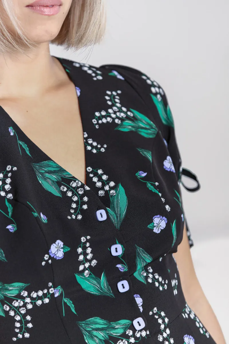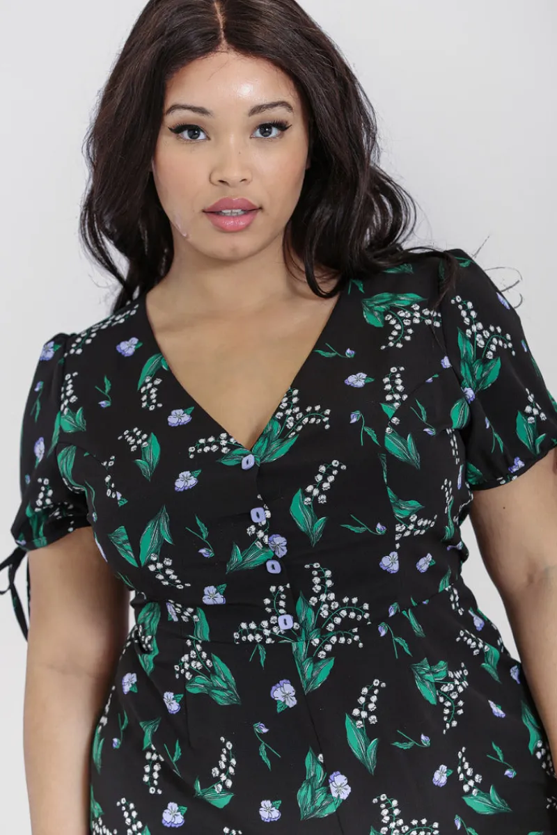 - Black playsuit decorated with delicate lilac and white flowers