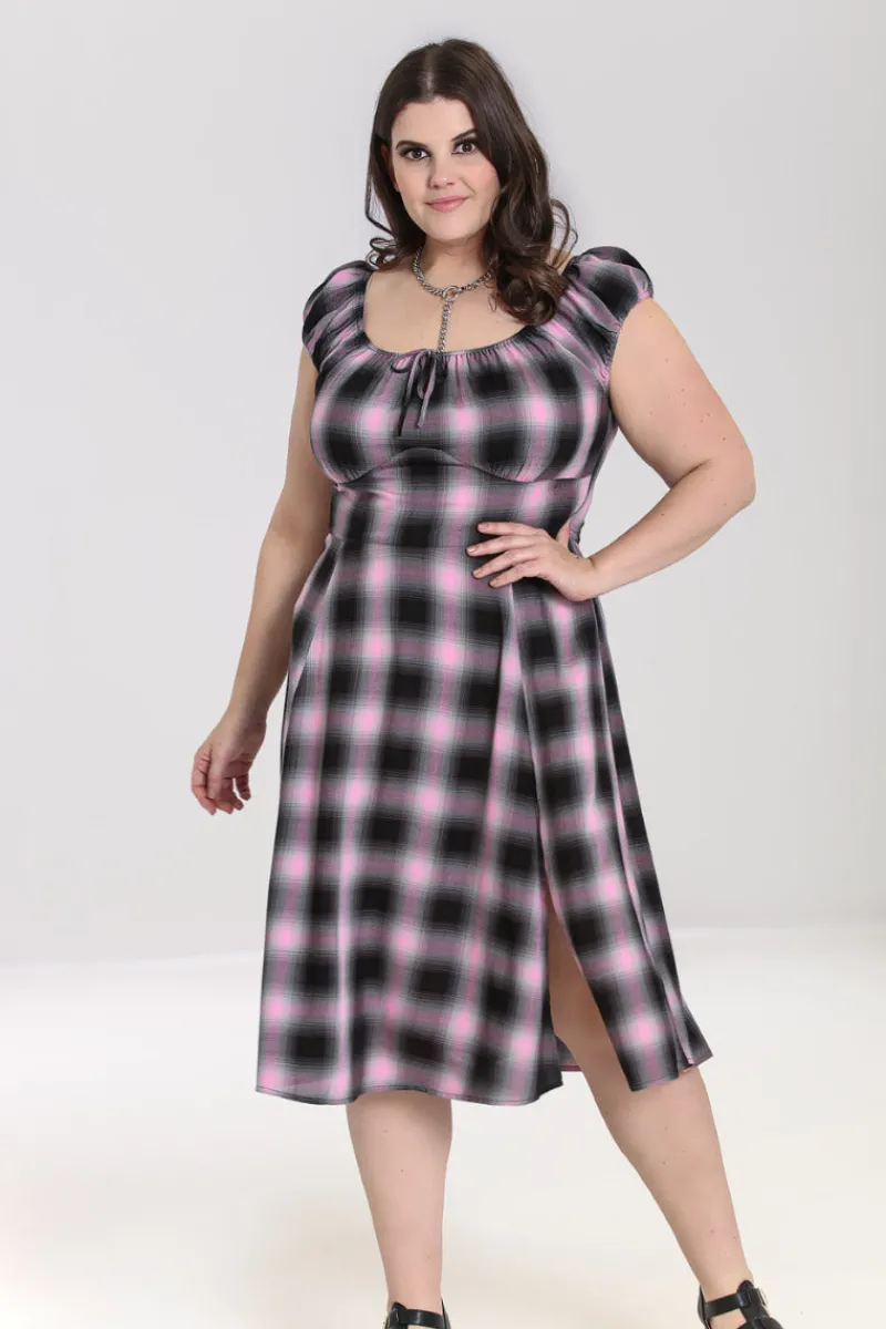 wardrobe with our Hayley Dress. - Black, grey & baby pink tartan fit-and-flare dress