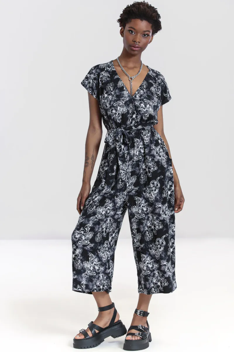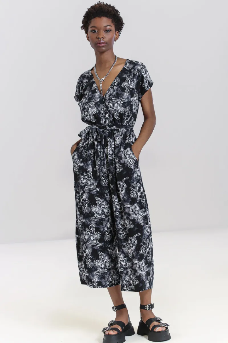 - Black and grey tie dye jumpsuit printed with white snakes, skulls and tropical flowers