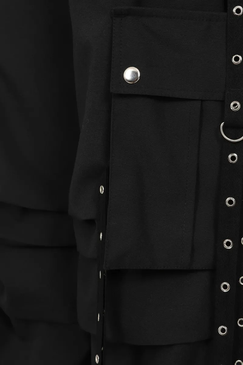 - Black eyelet ribbon detail hanging from sides of legs & from the back pockets
