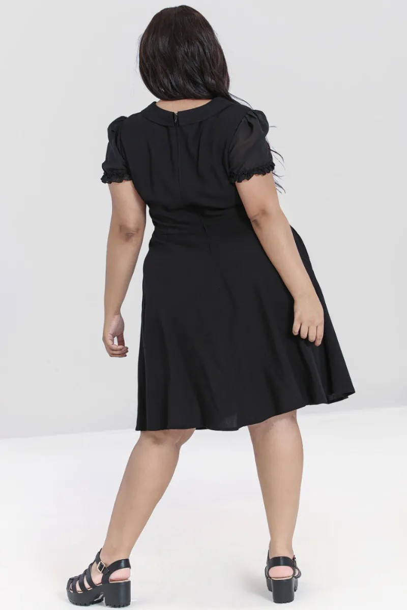 - Black fit-and-flare mid dress with delicate white embroidery on the collar