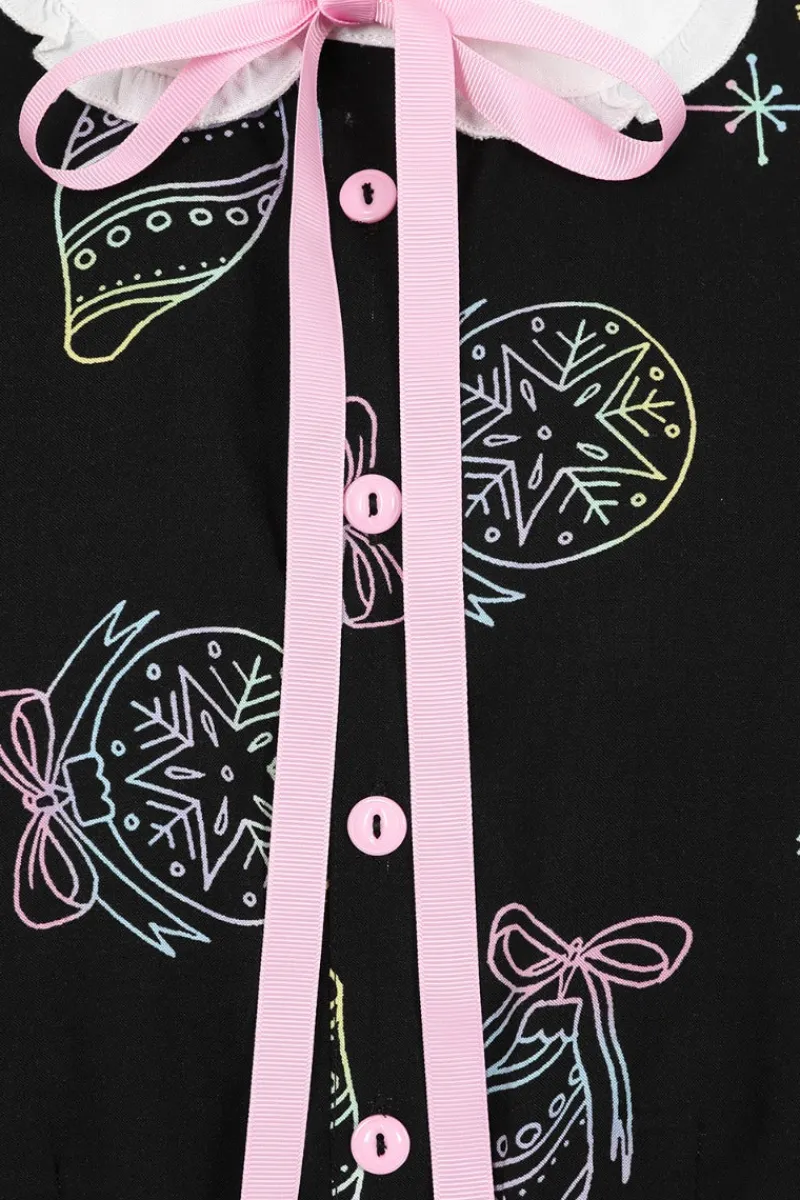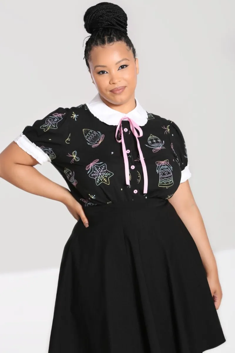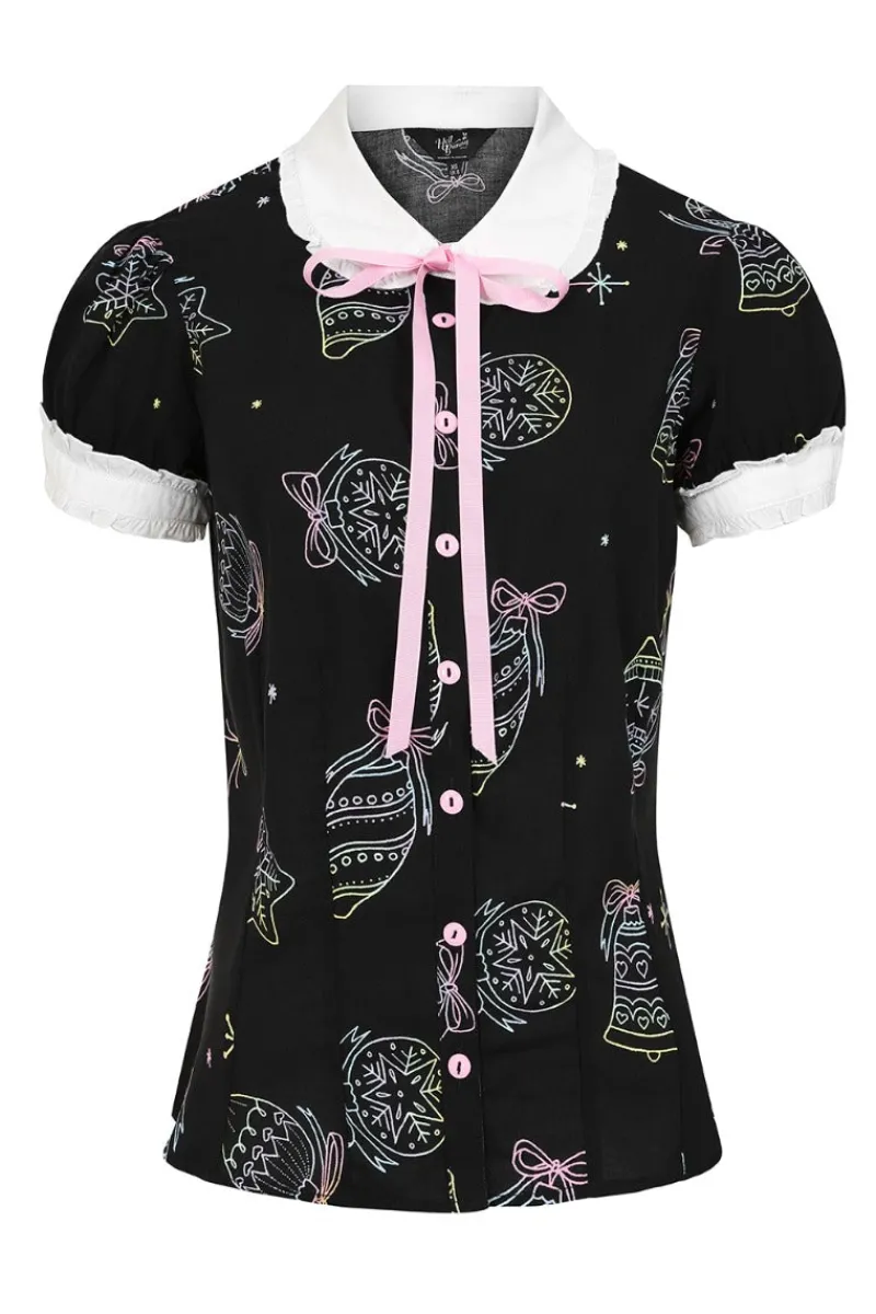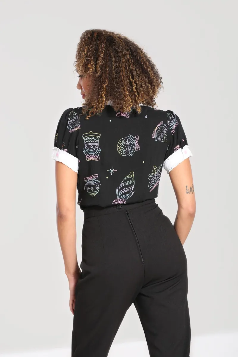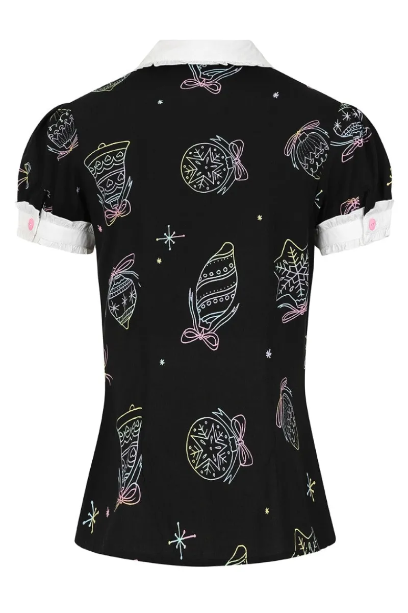 - Black semi-fitted blouse printed with pastel festive illustrations