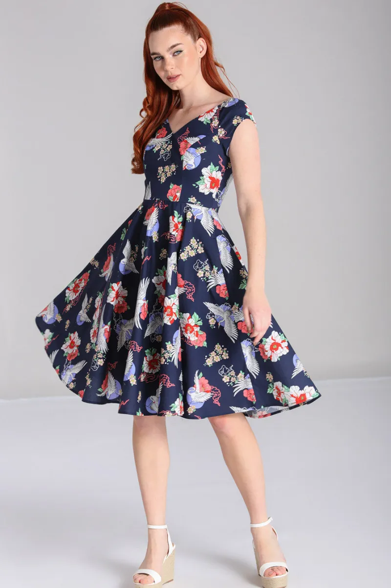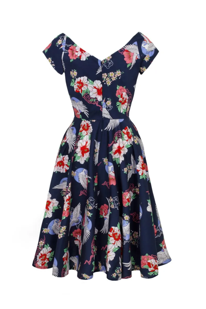 - Navy base with large floral drawings and flying cranes in red, pinks & white