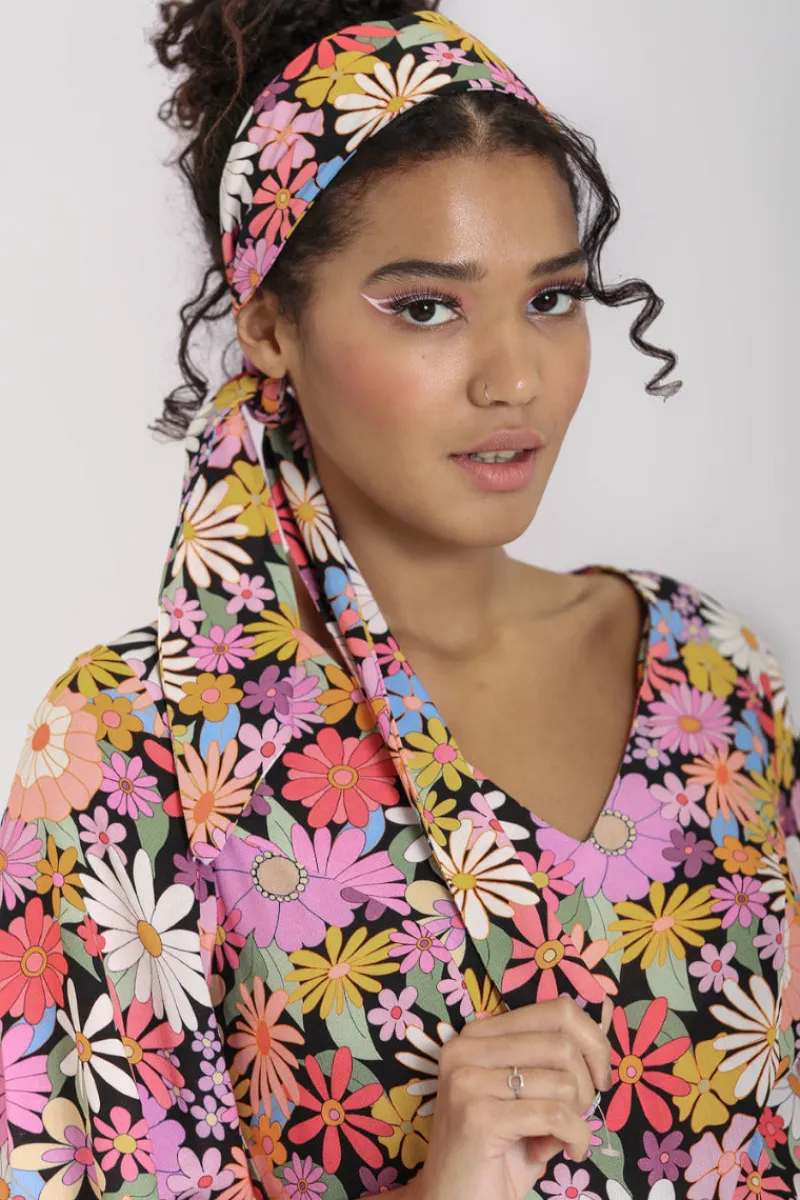 - Fun print of multicoloured flowers all over a black base