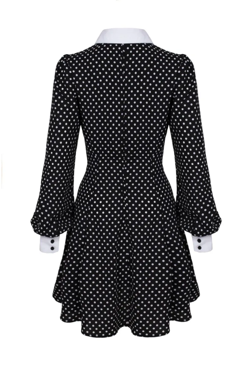- Main fabric is black with white polka dots