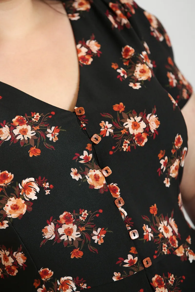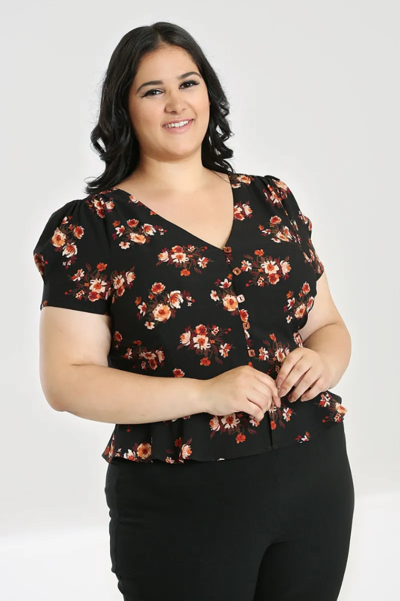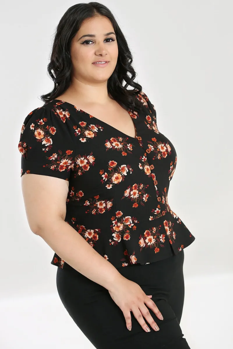 - Black peplum style blouse decorated with delicate autumn leaves and flowers