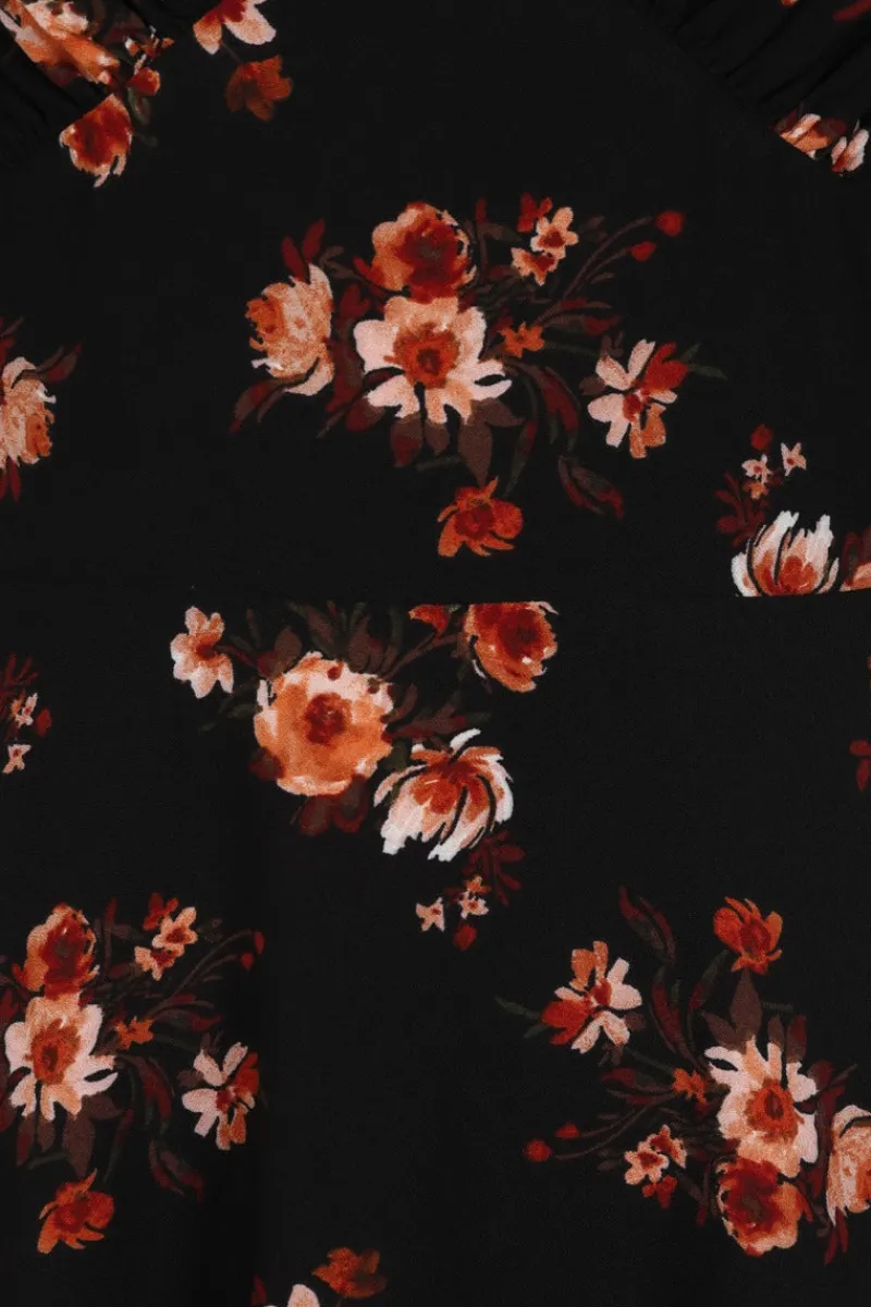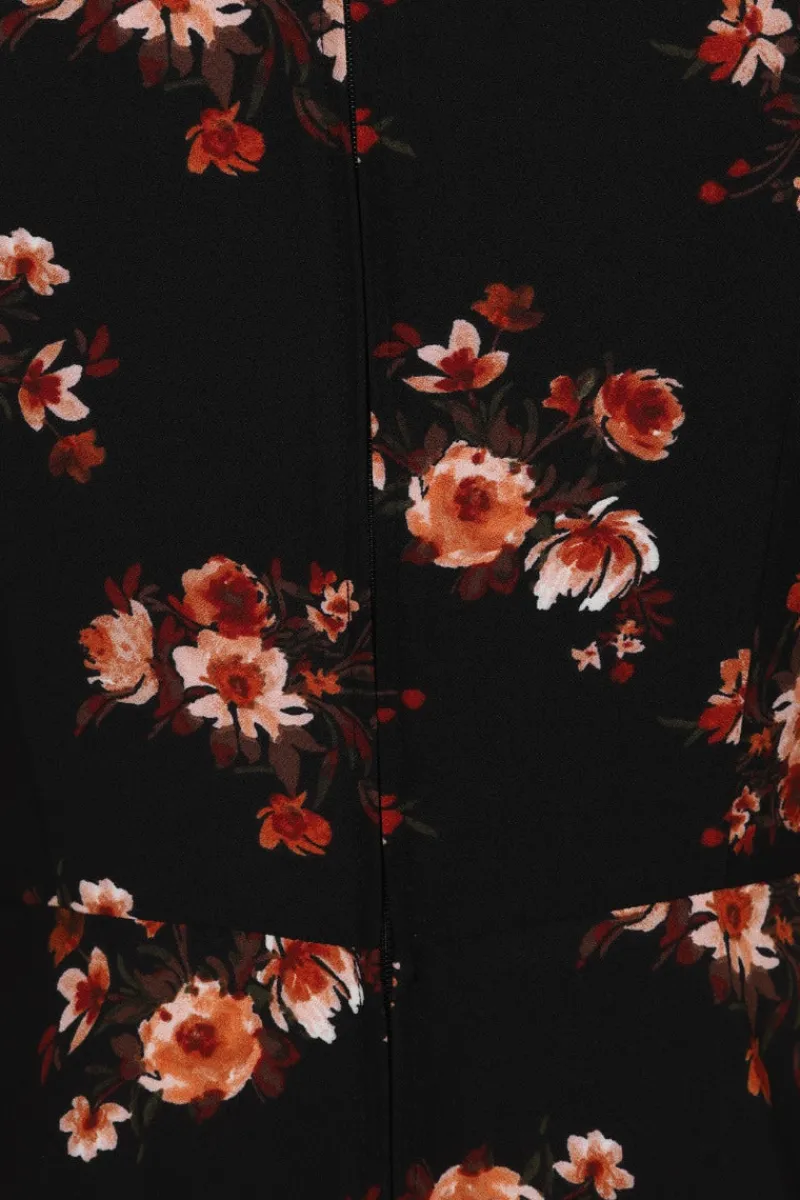 - Black dress decorated with delicate autumn leaves and flowers