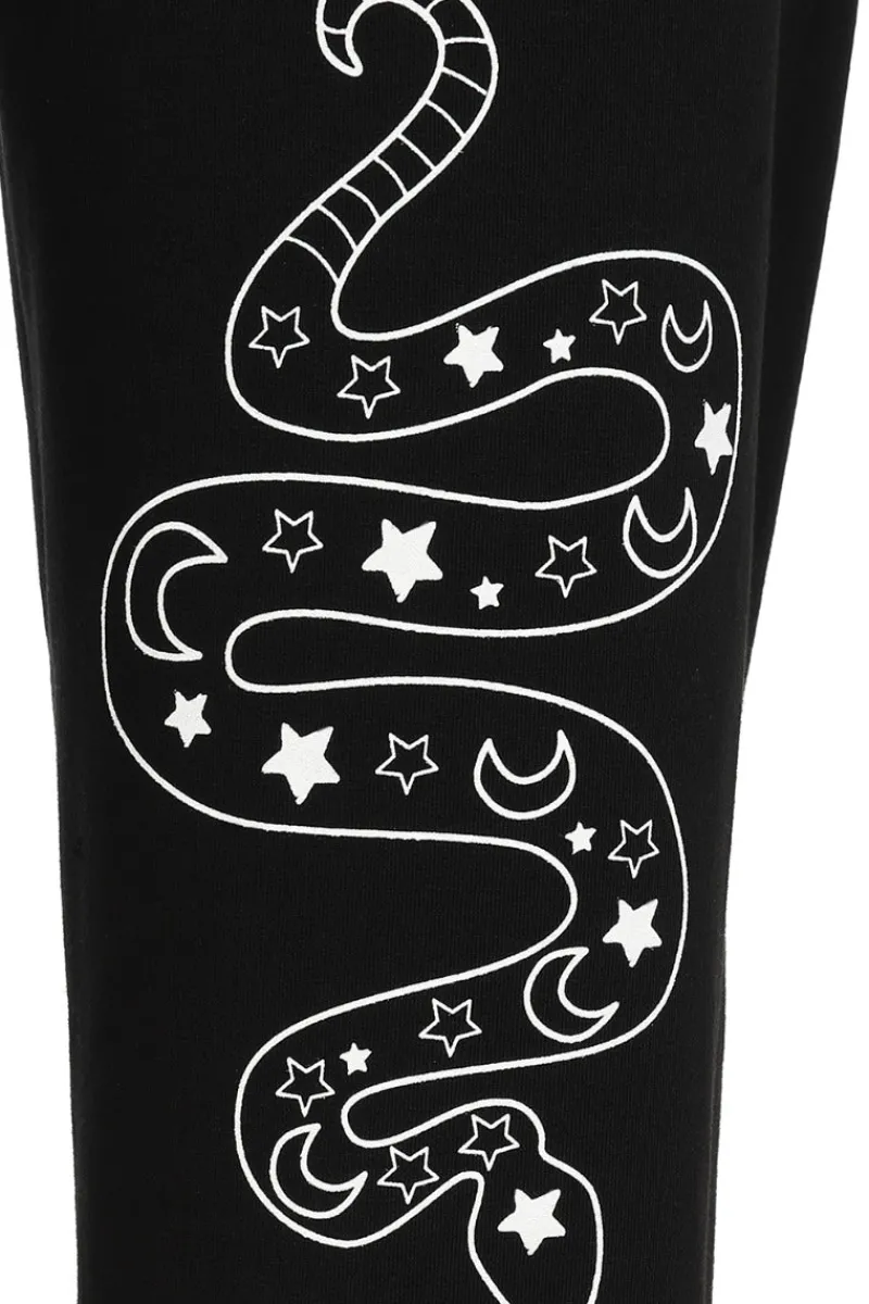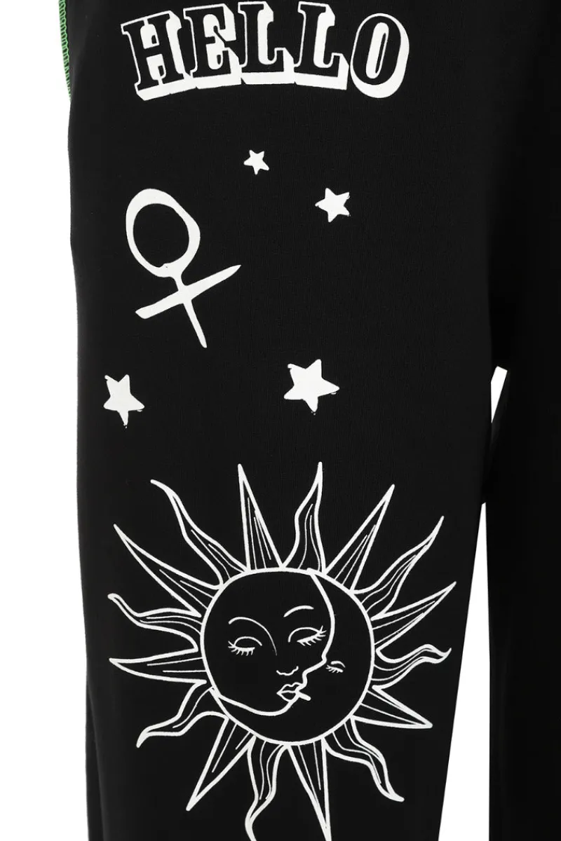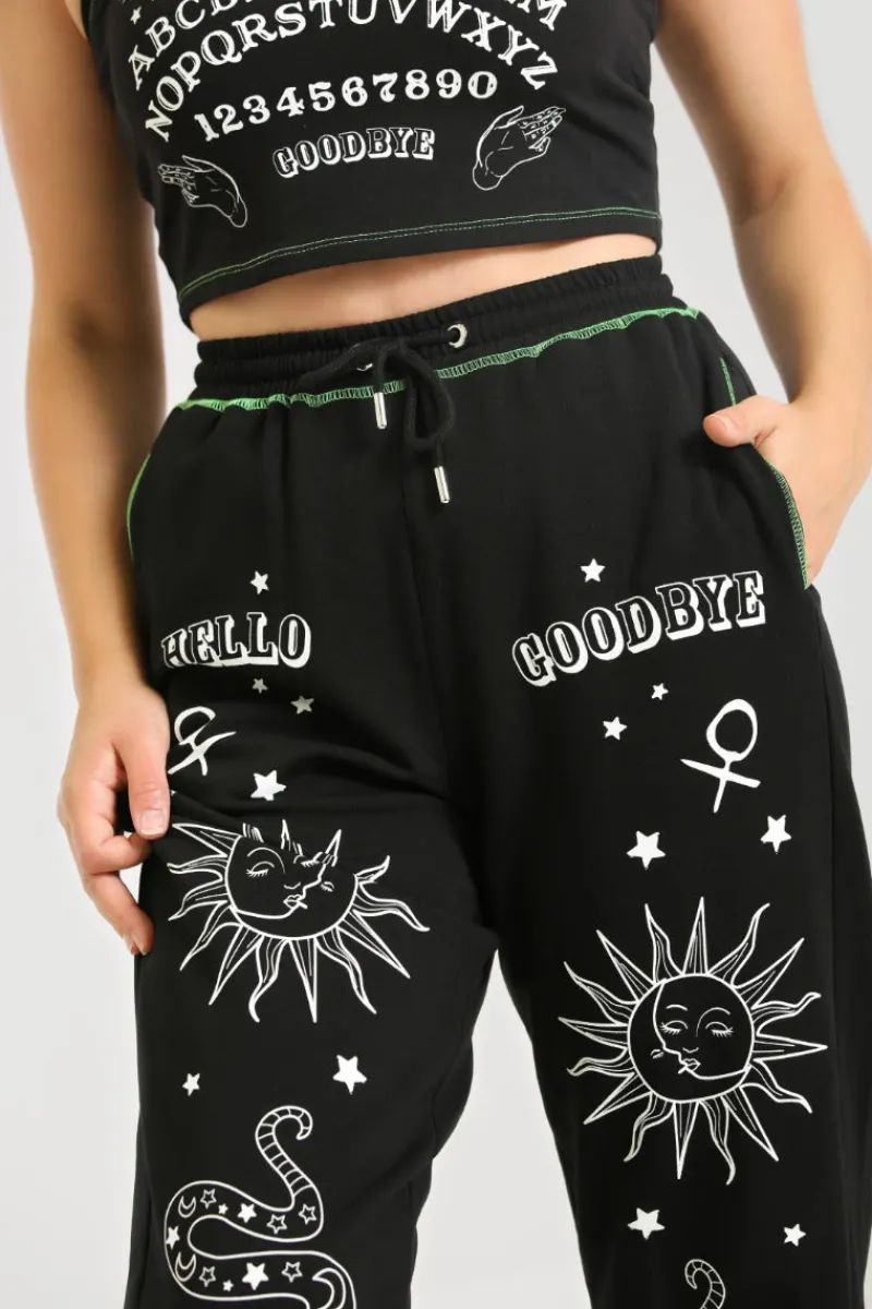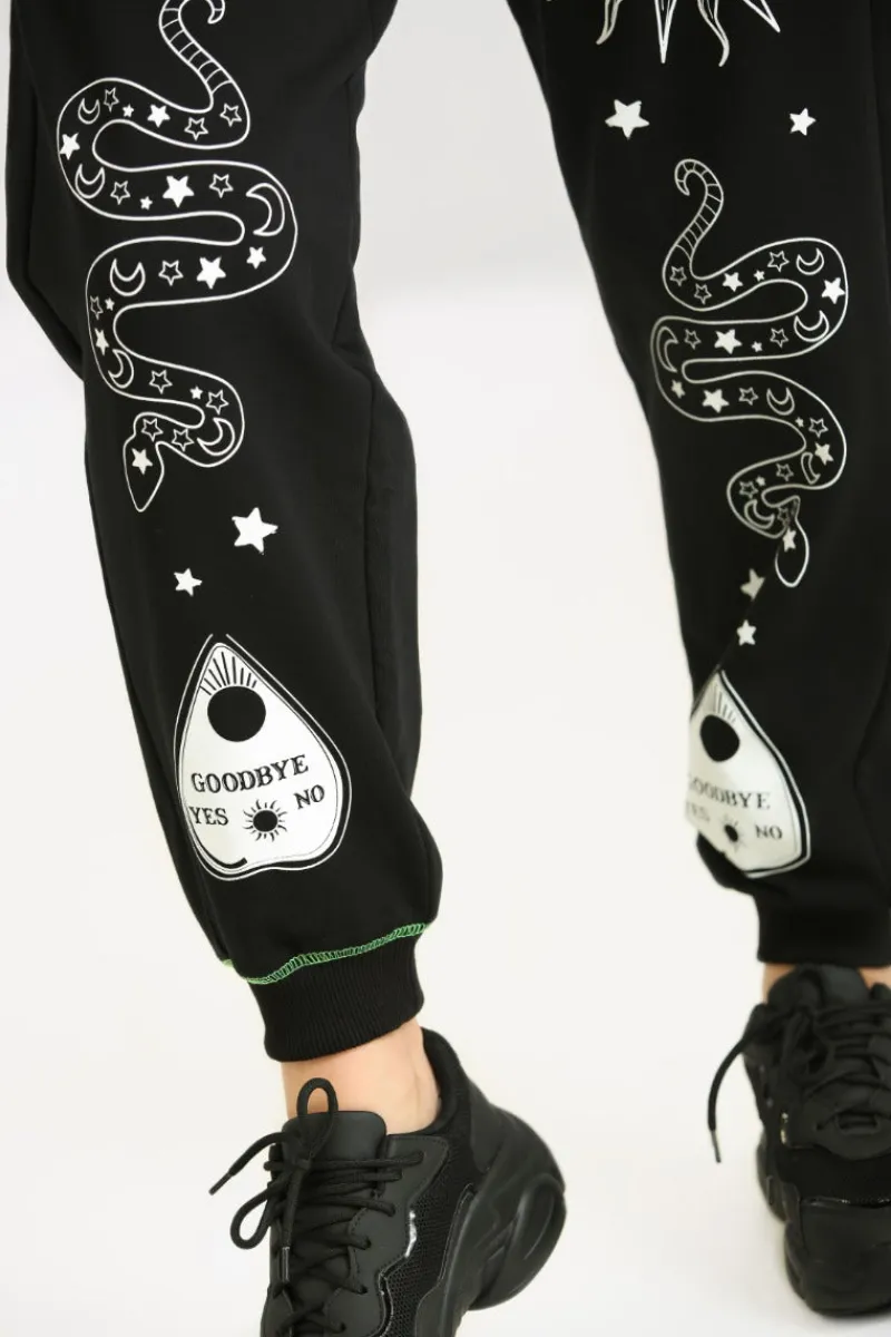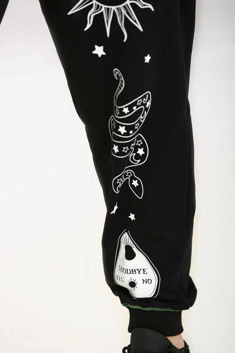 - Black cuffed joggers decorated with white ouija symbols