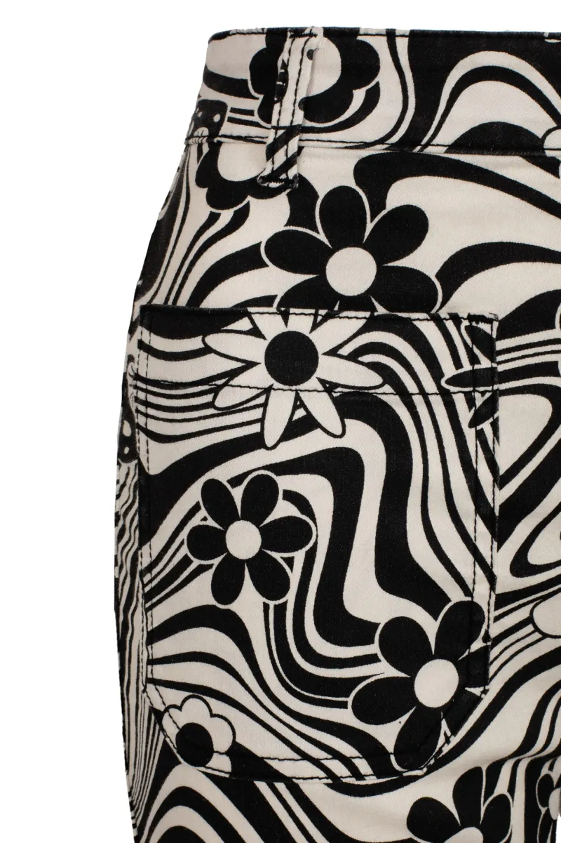 - Ivory base with black 70s style artwork of flowers and mushrooms