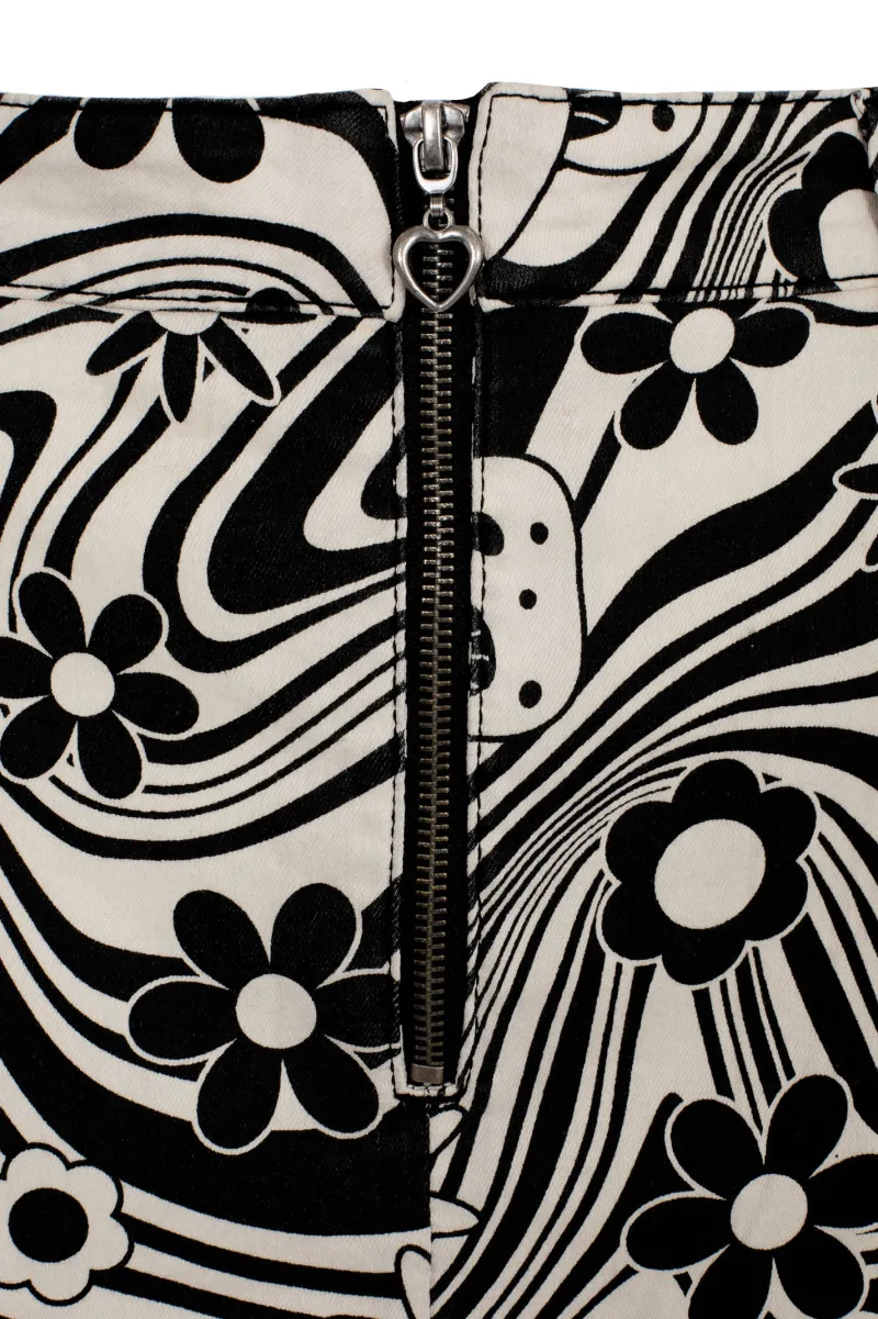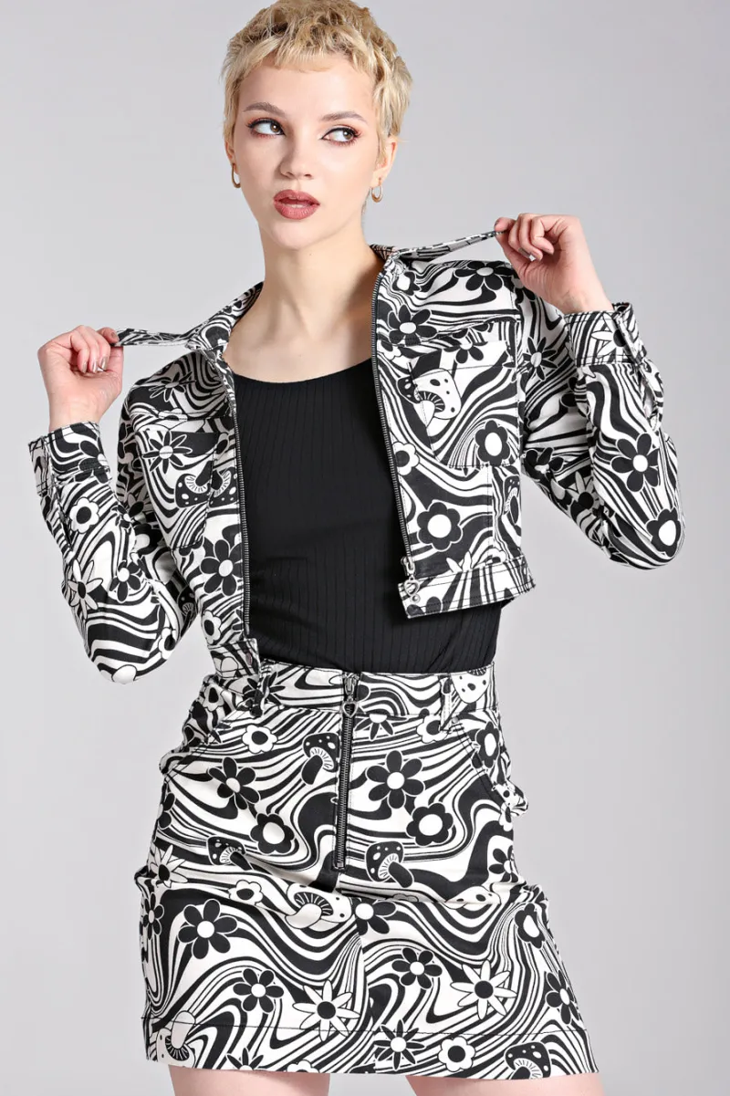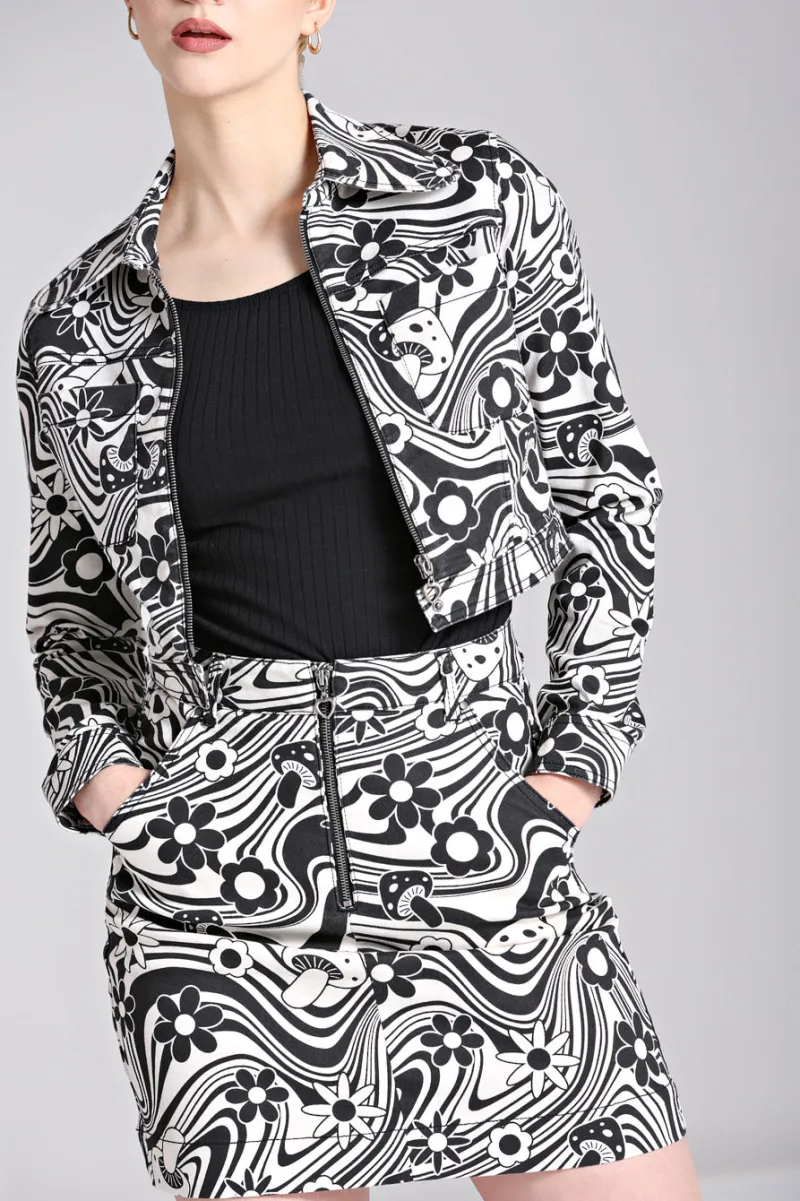 - Ivory base with black 70s style artwork of flowers and mushrooms