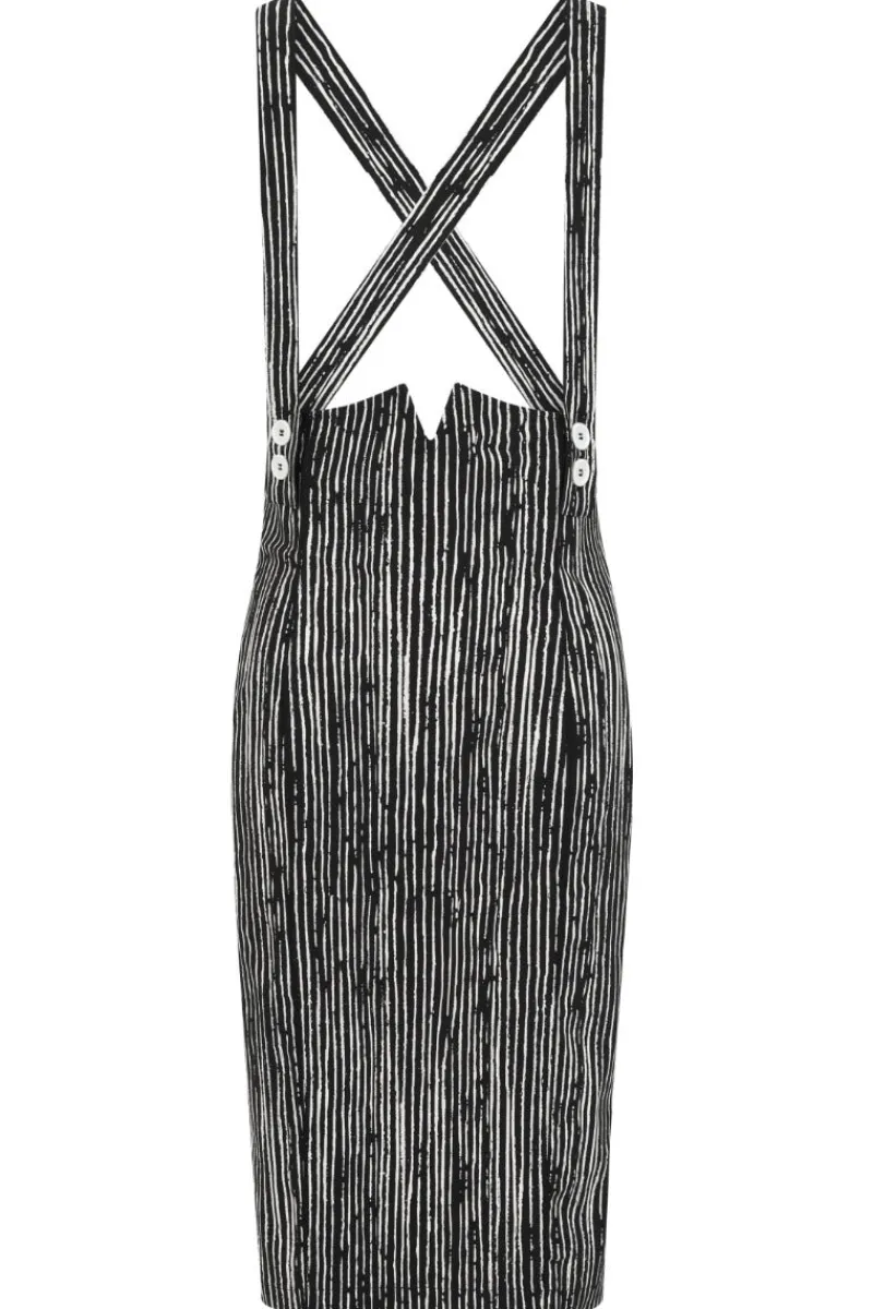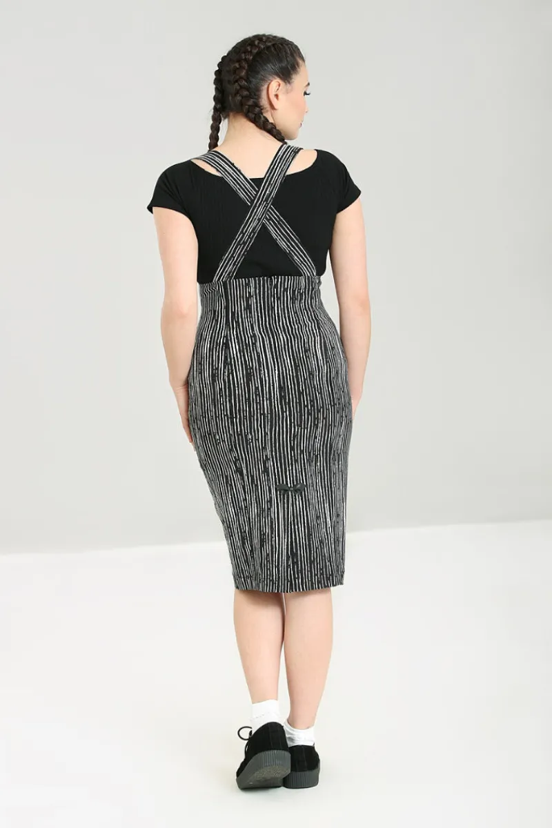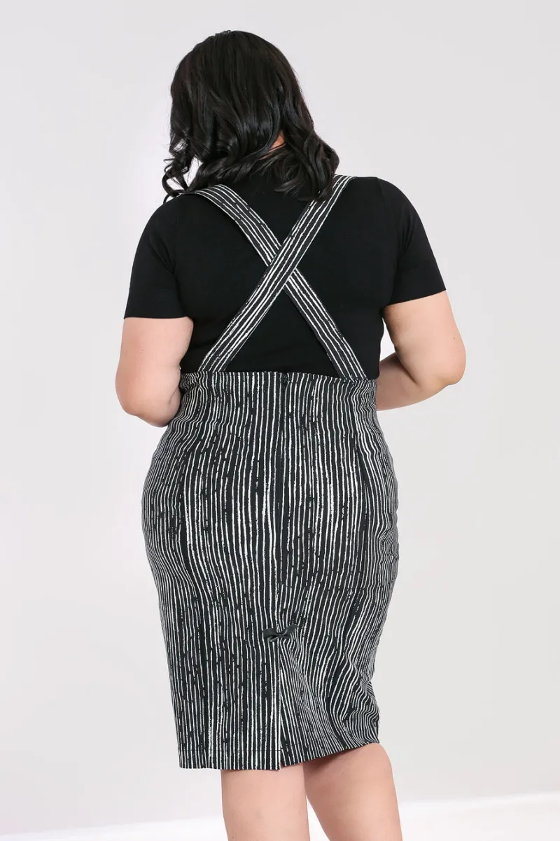 - Black pencil style pinafore skirt decorated with white scratch mark stripes