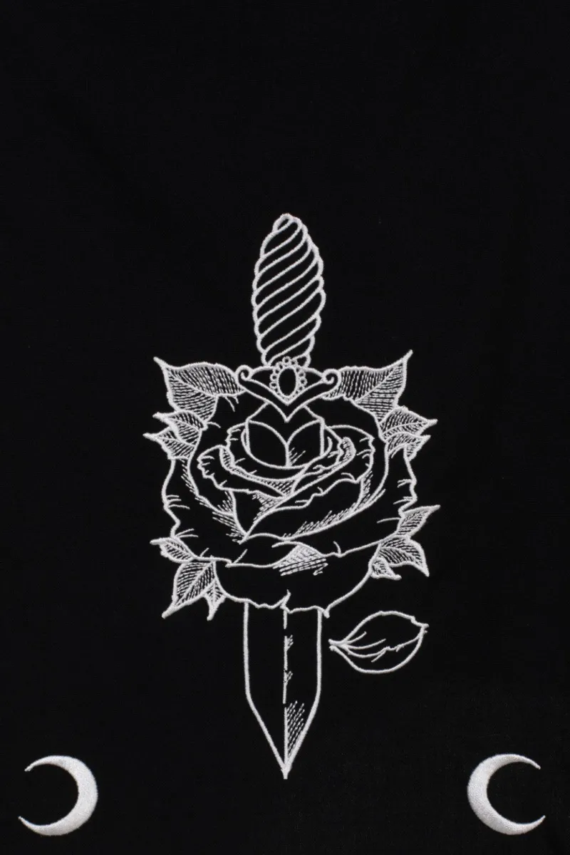 - Flat panel on centre front with white contrasting embroidery of rose & dagger