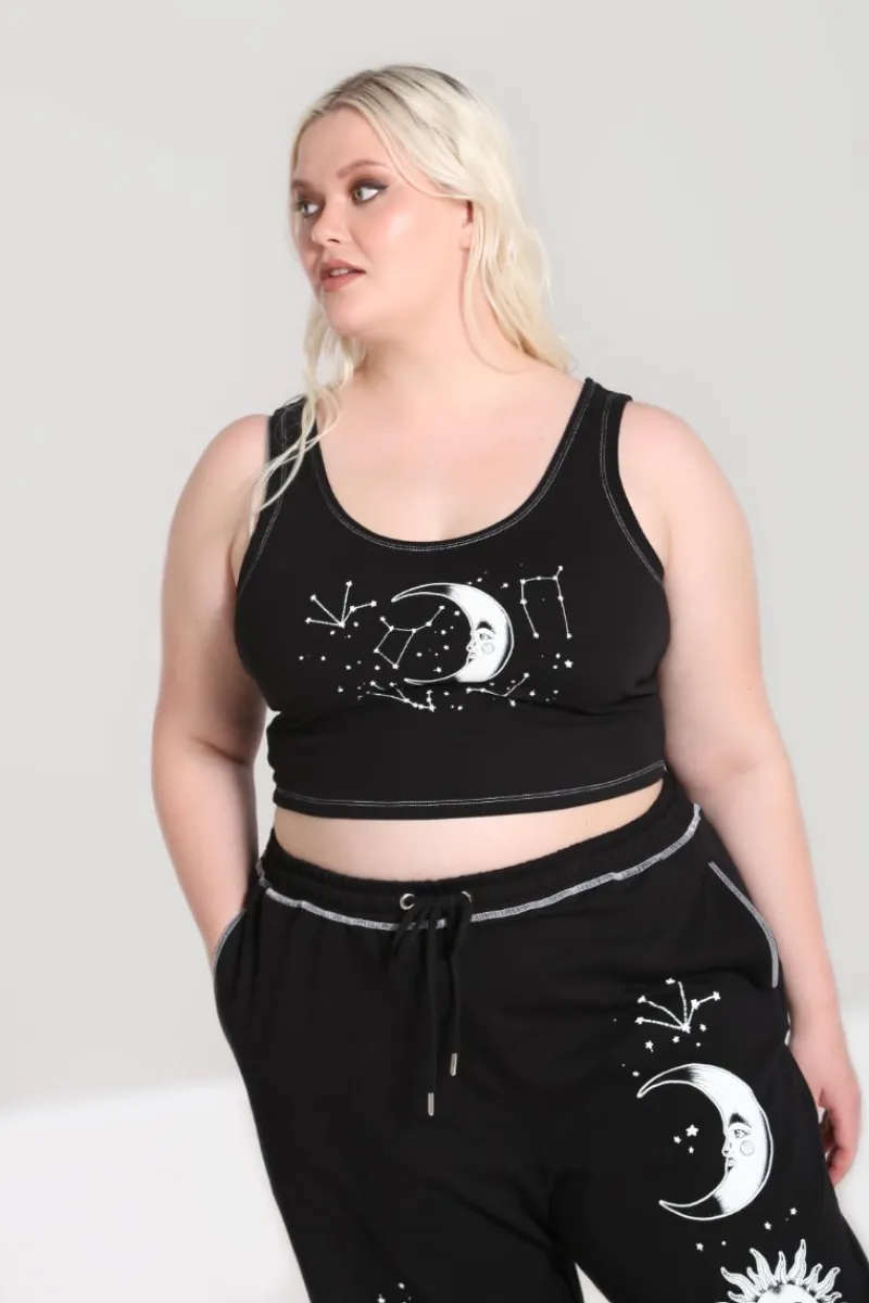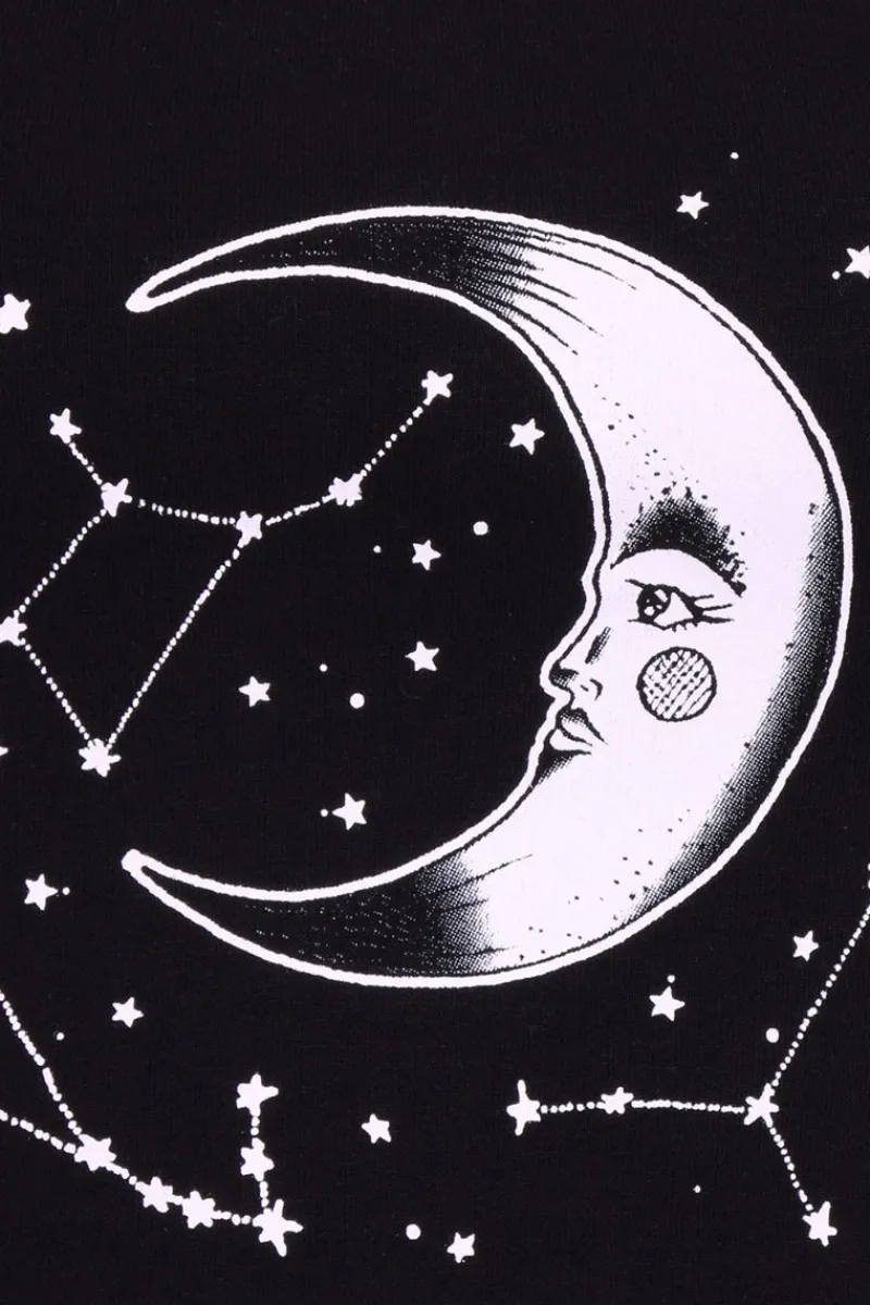 - Black fitted cropped top decorated with a starry sky and crescent moon artwork on the front