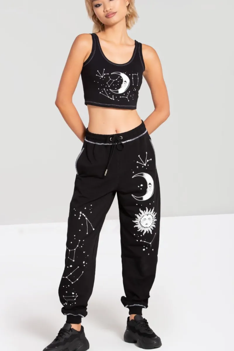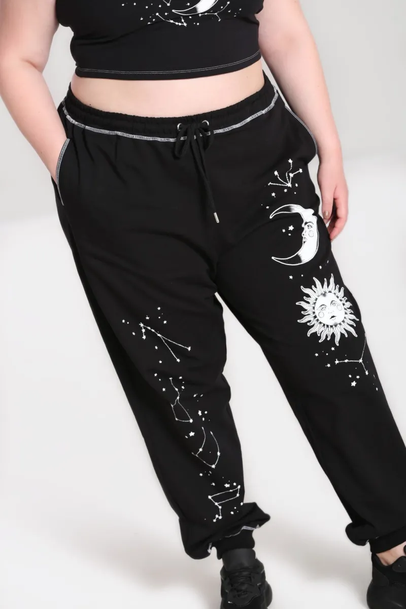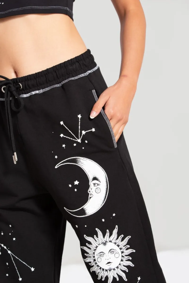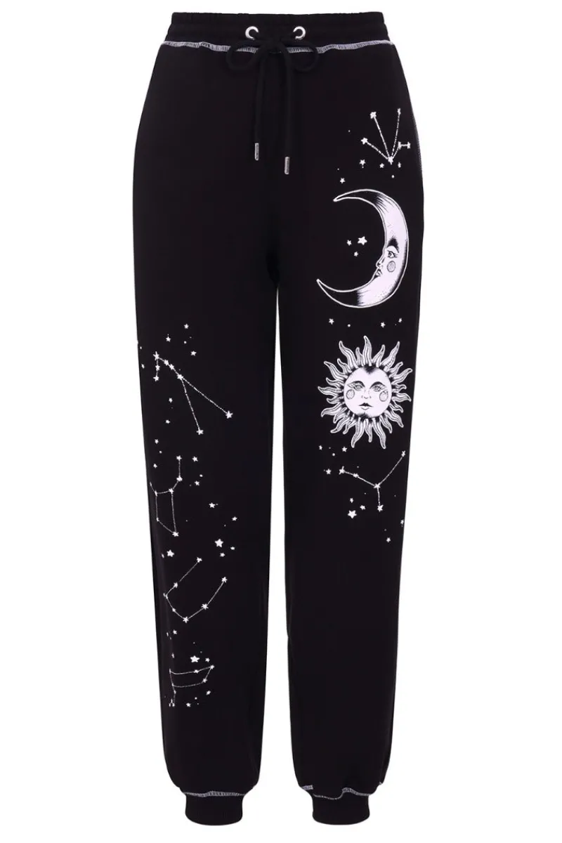 - Black jersey joggers decorated with large celestial artwork on both legs