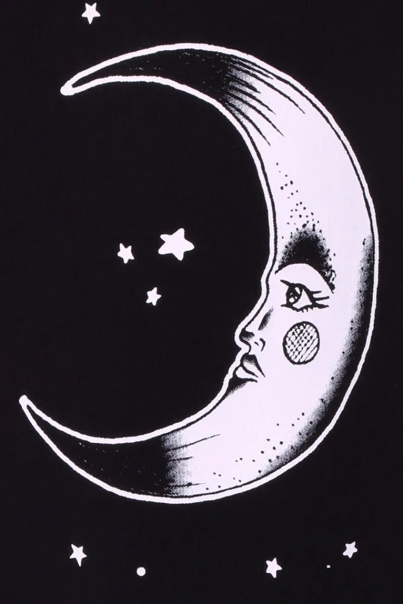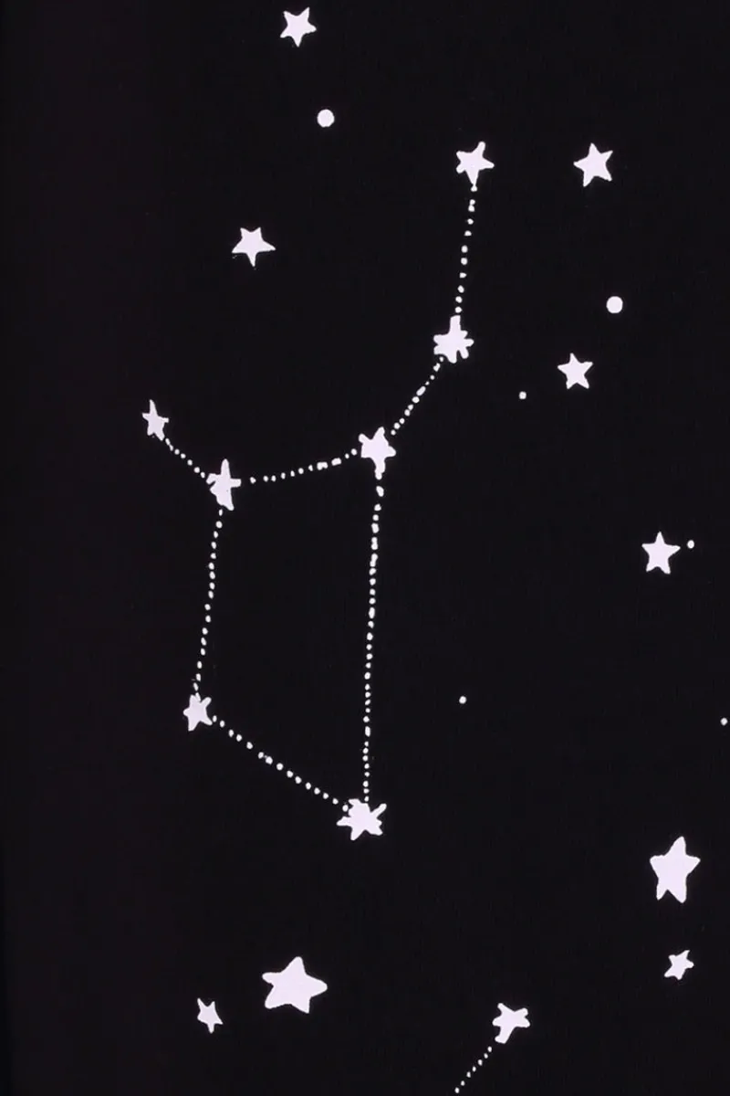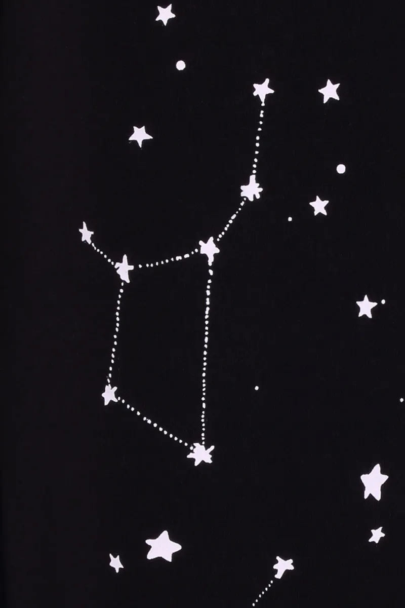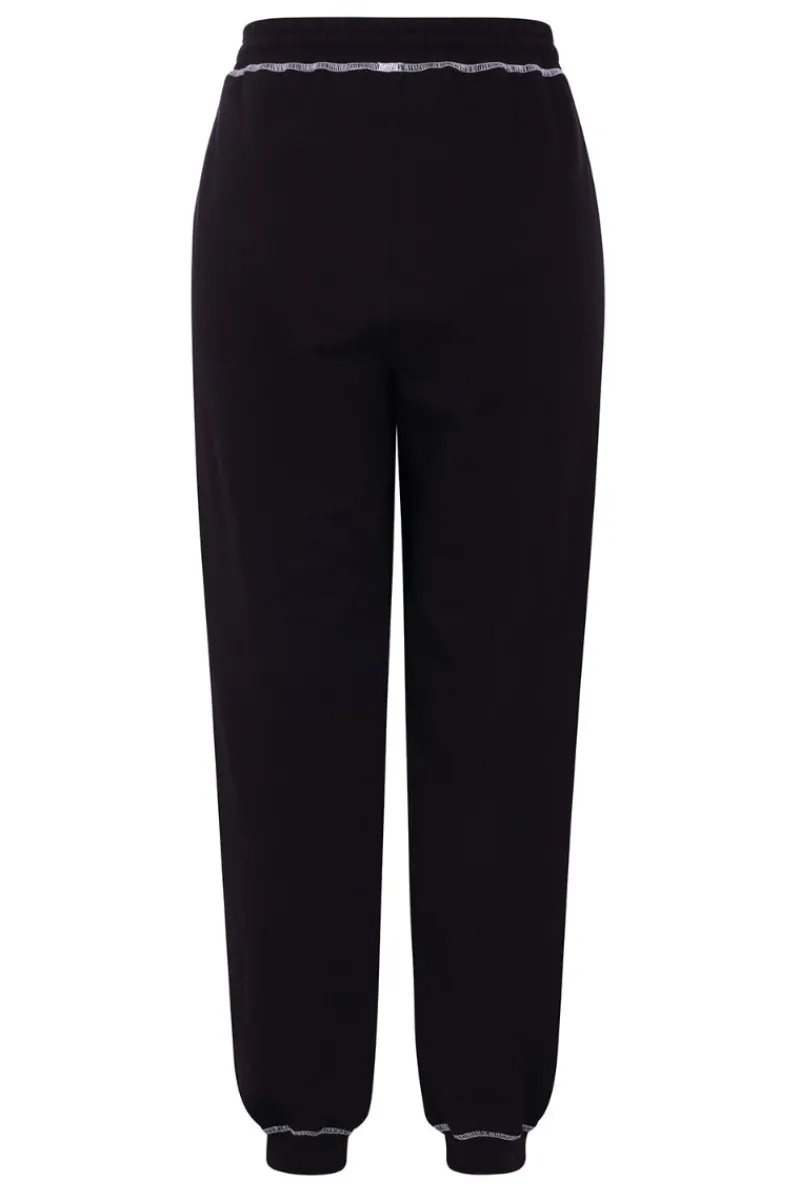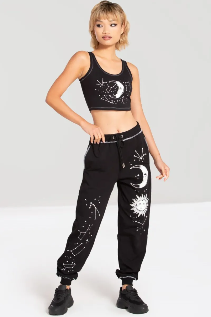 - Black jersey joggers decorated with large celestial artwork on both legs