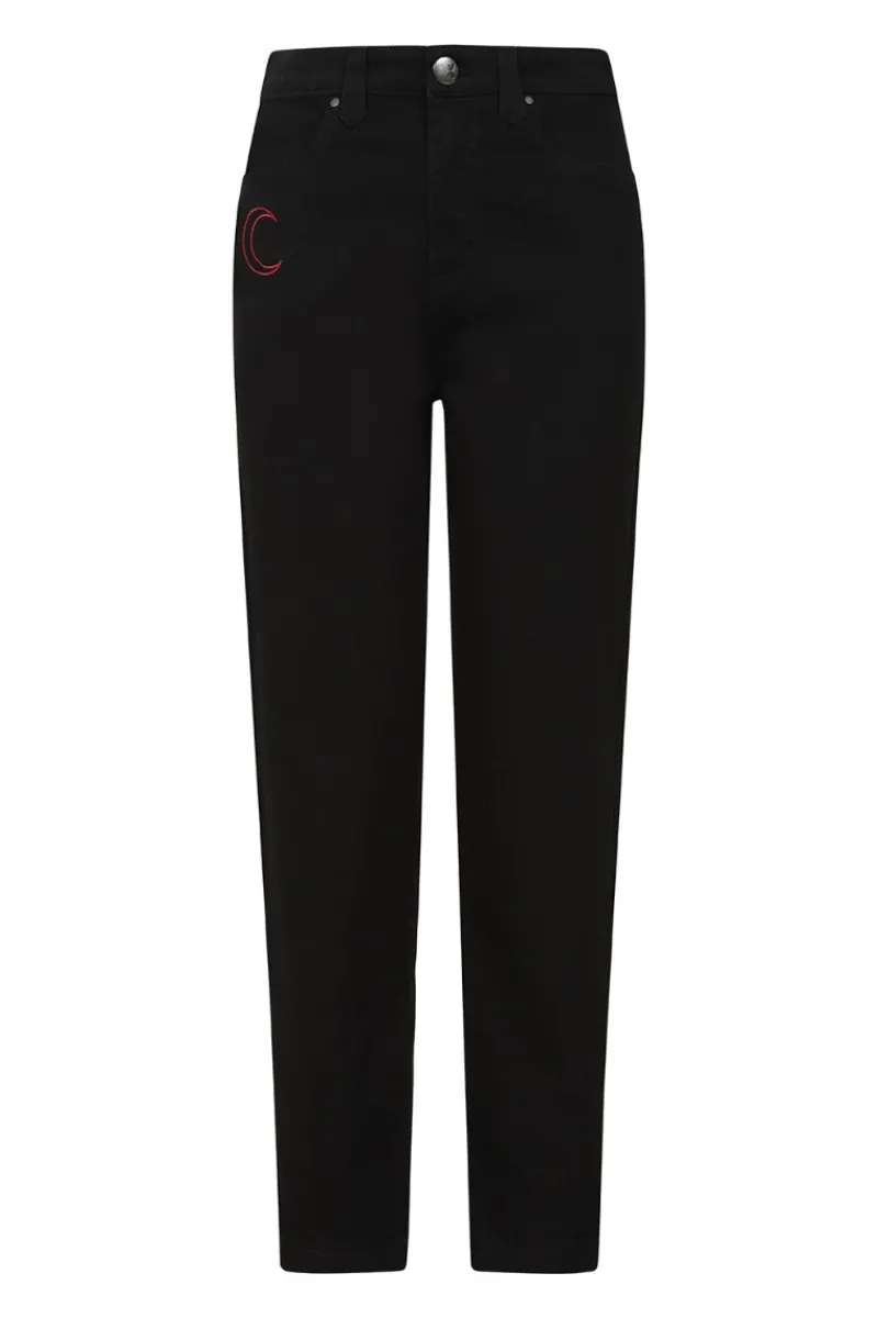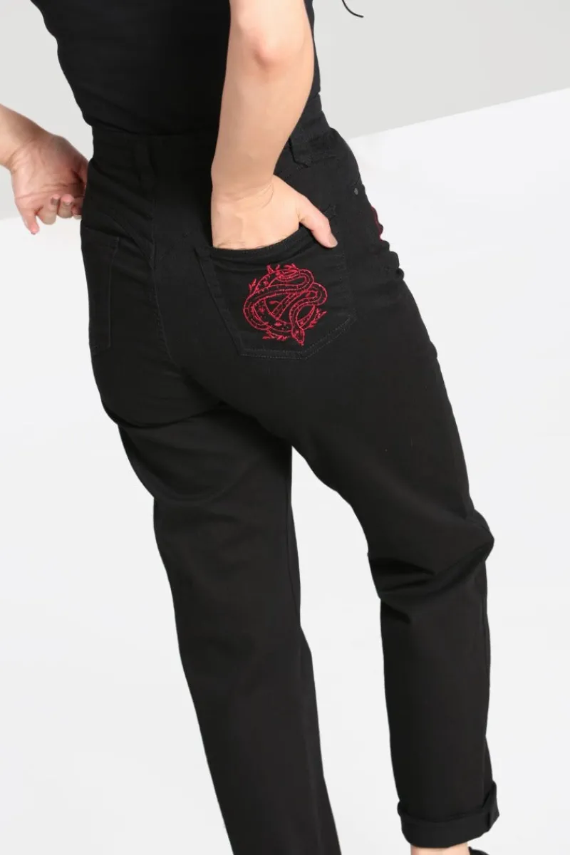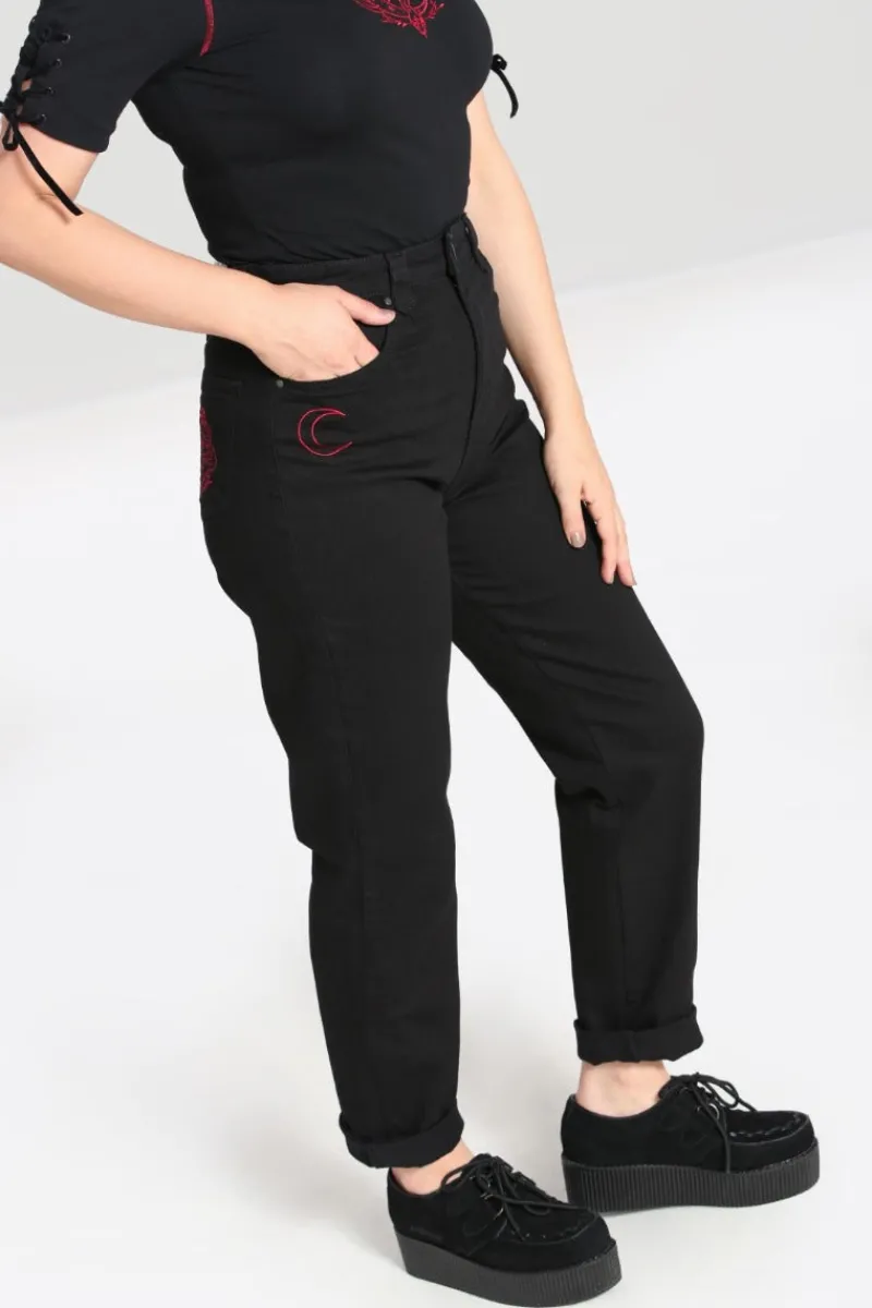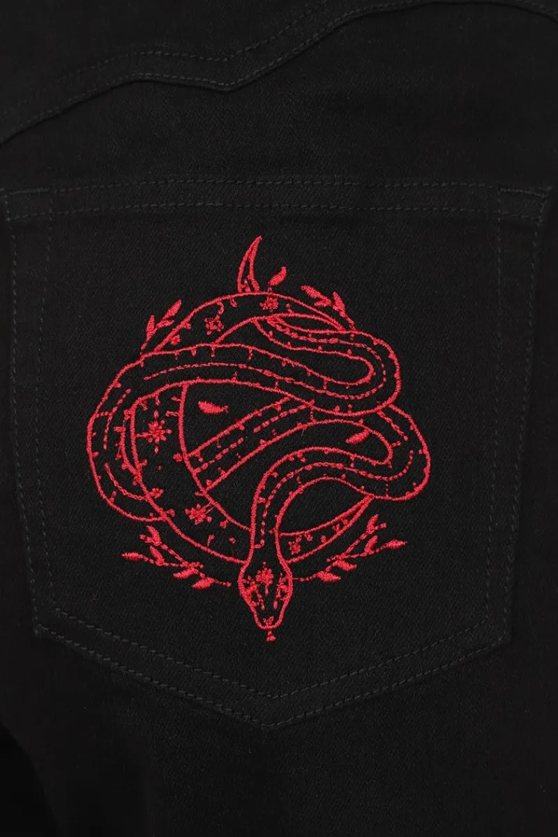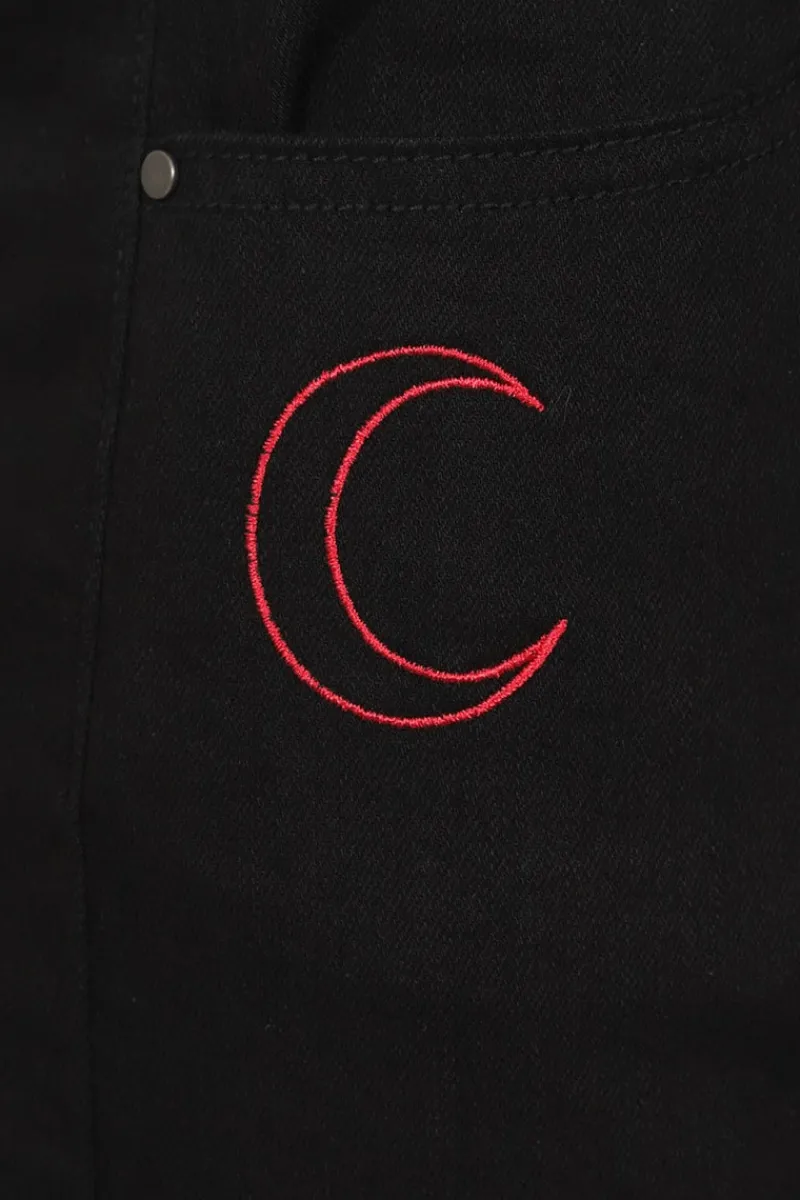 - Contrasting red embroidered moon design on front and snake & moon design on back pocket