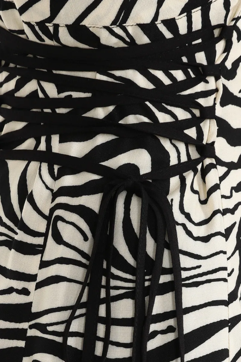 - Black & cream zebra print mini dress featuring black lace up detailing on either side